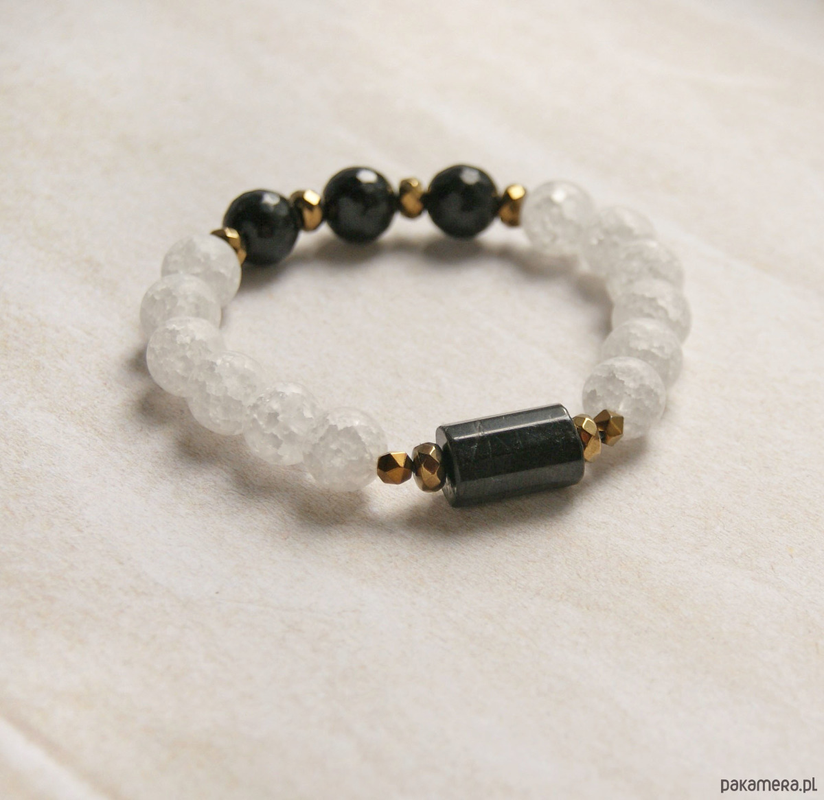 OKAZAŁA, niezwykle efektowna bransoletka na solidnej lince elastycznej, wykonana z matowego kwarcu lodowego (10mm), fasetowanego wałka czarnego turmalinu (ok.16mm). fasetowanego onyksu(10mm), oponek fasetowanego hematytu.