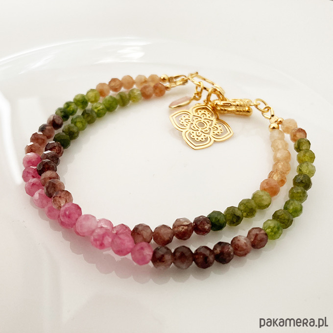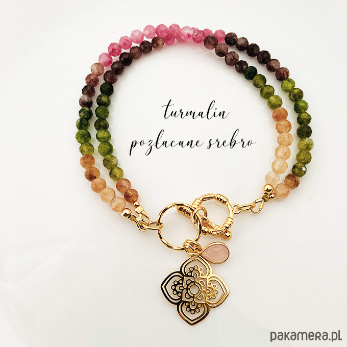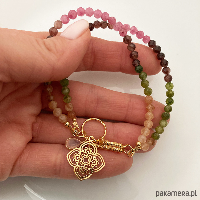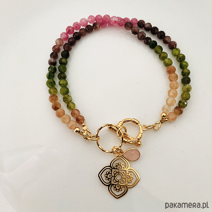 Efektowna podwójna bransoletka z pięknych fasetowanych Turmalinów z delikatną orientalną zawieszką oraz oprawionym kamieniem różowym kwarcem. Wykonana ręcznie z dwóch sznurów naturalnych kamieni i srebrnych złoconych 24 k złotem koralików i elementów.