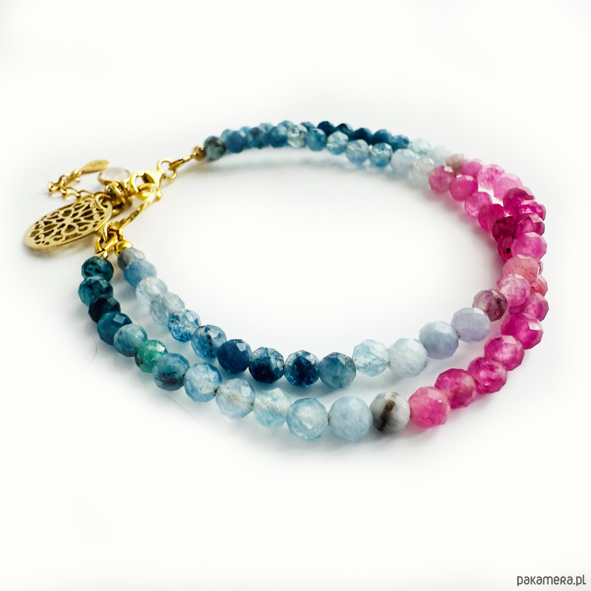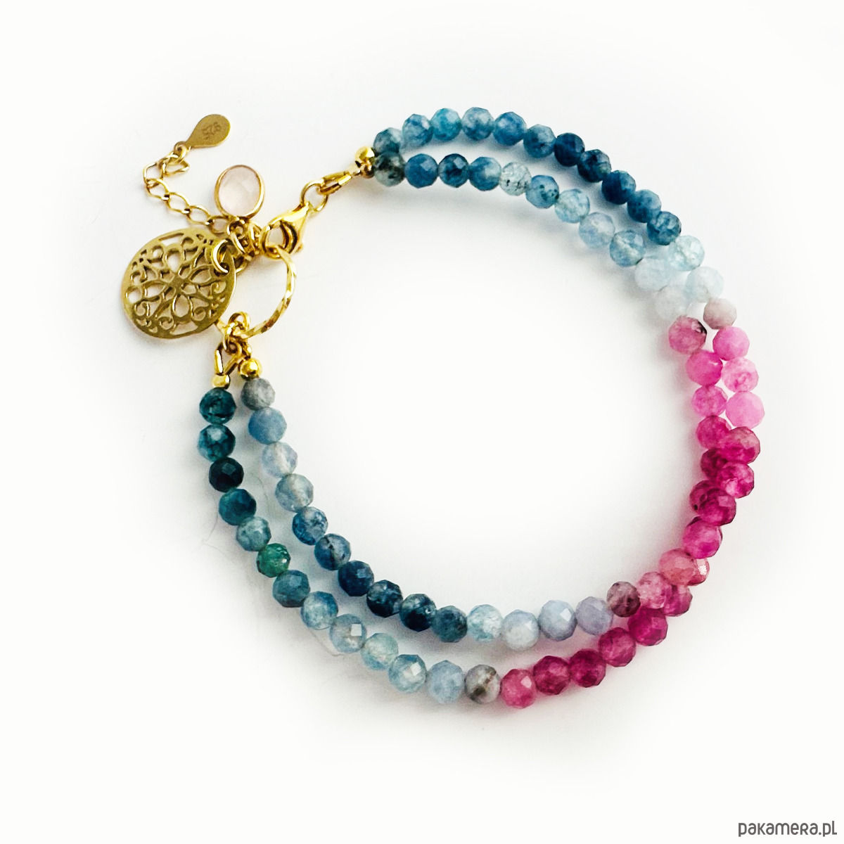 Efektowna podwójna bransoletka z pięknych fasetowanych Turmalinów z delikatną zawieszką rozetką oraz oprawionym kamieniem różowym kwarcem. Wykonana ręcznie z dwóch sznurów naturalnych kamieni i srebrnych złoconych 24 k złotem koralików i elementów.