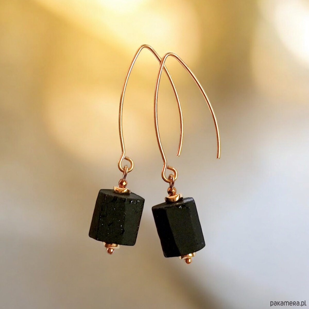 Wykonane z surowych, ciosanych bryłek czarnego turmalinu (ok. 11x11mm) oraz przekładek ze złotego hematytu.