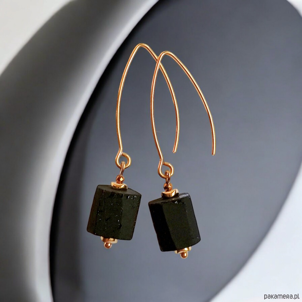 Wykonane z surowych, ciosanych bryłek czarnego turmalinu (ok. 11x11mm) oraz przekładek ze złotego hematytu.