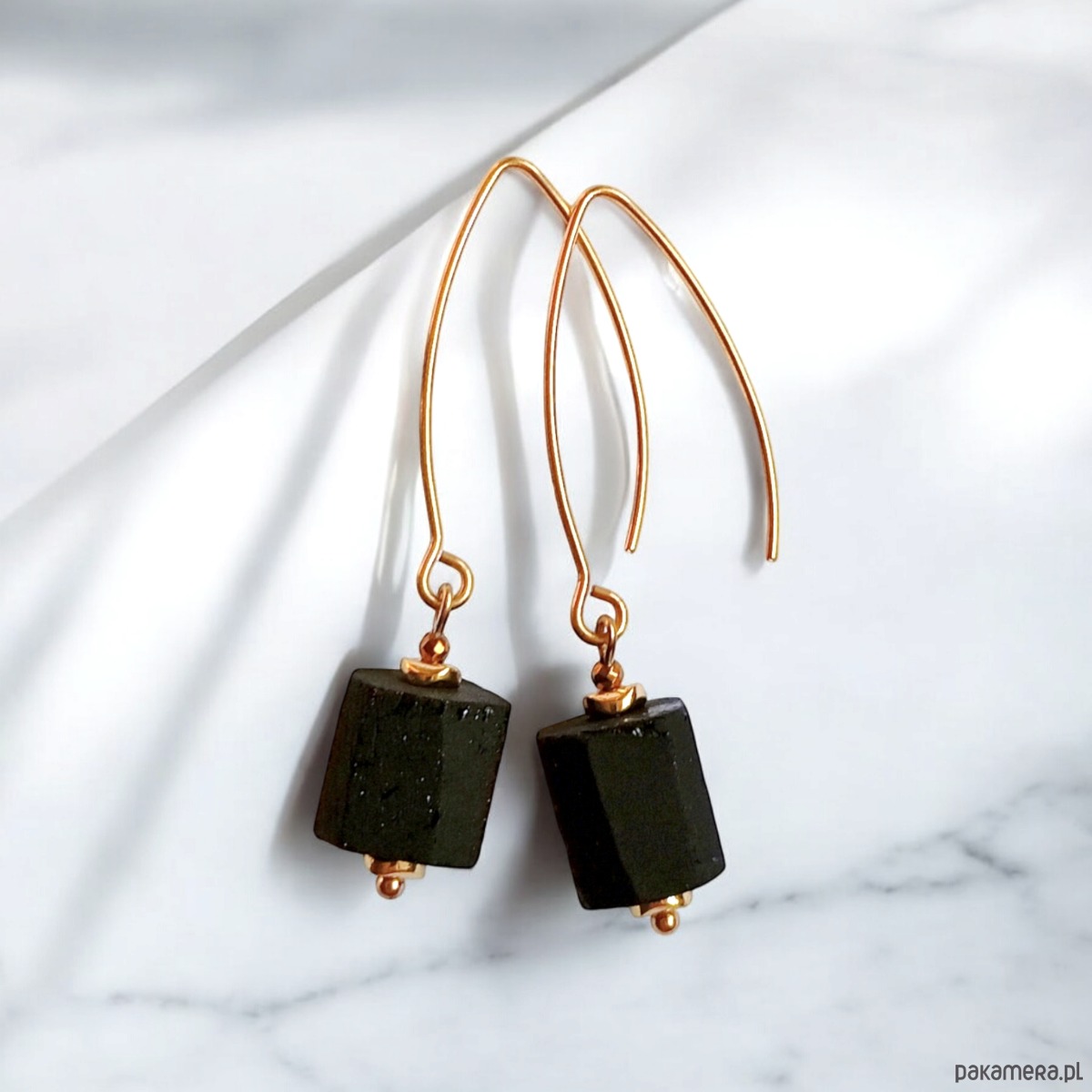 Wykonane z surowych, ciosanych bryłek czarnego turmalinu (ok. 11x11mm) oraz przekładek ze złotego hematytu.