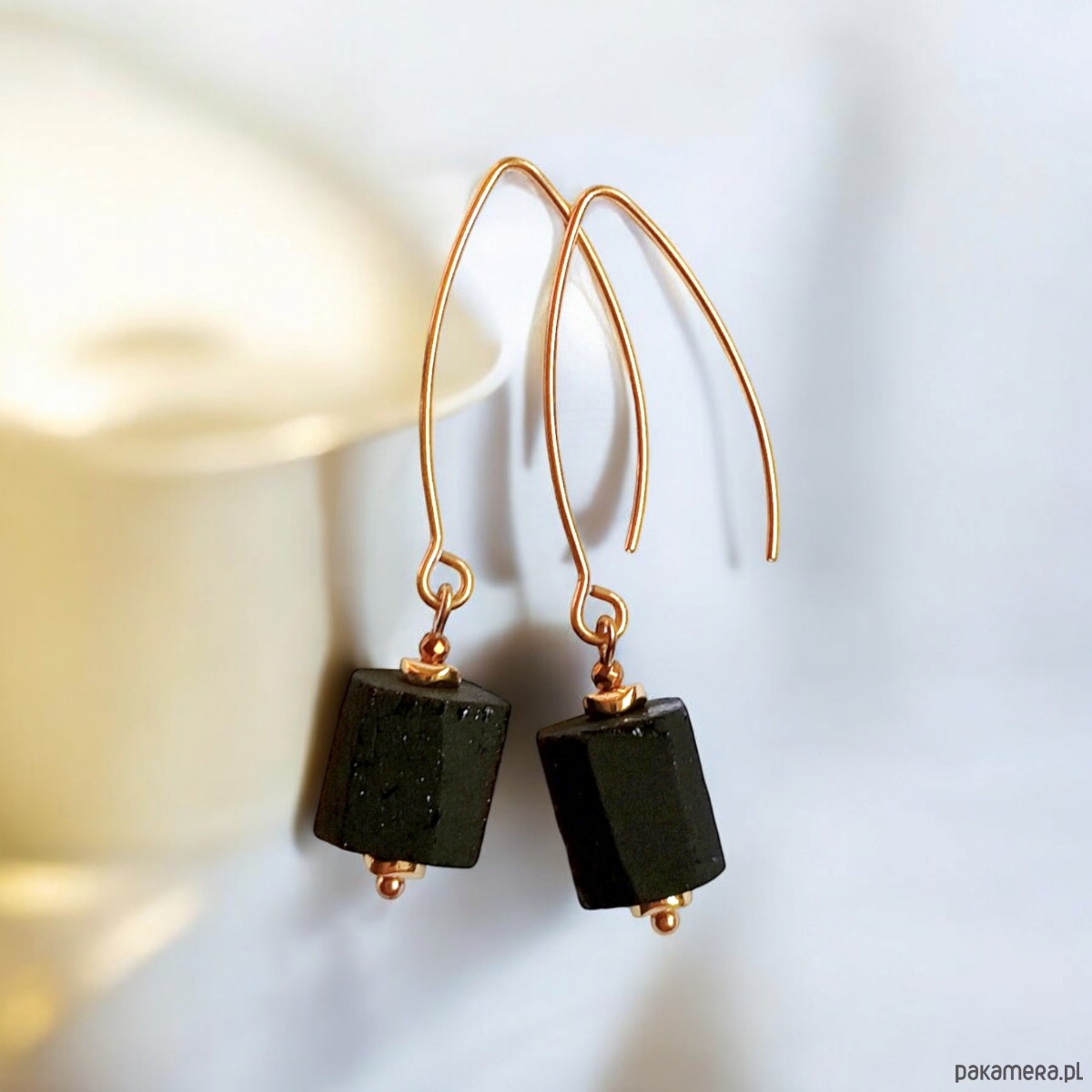 Wykonane z surowych, ciosanych bryłek czarnego turmalinu (ok. 11x11mm) oraz przekładek ze złotego hematytu.