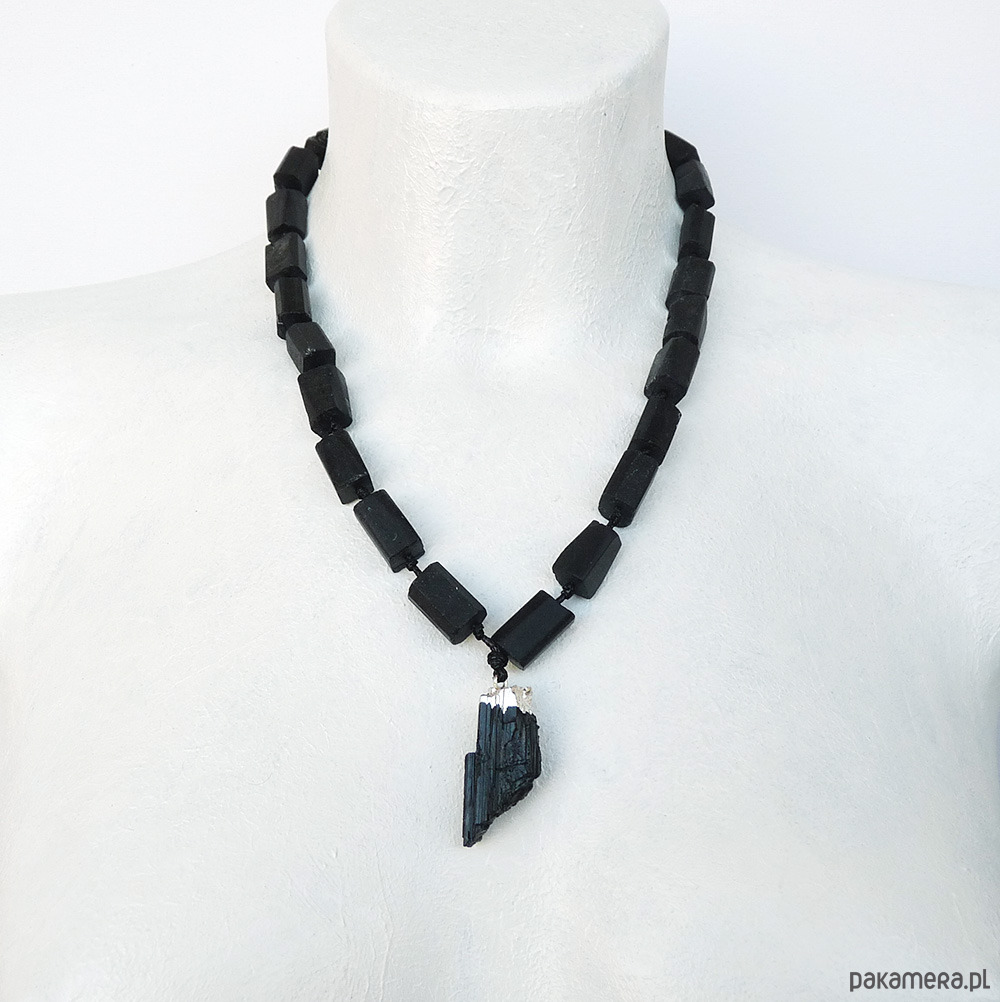 zawieszka: czarny, surowy turmalinem (otoczka w kolorze srebrnym) o wymiarach 35x14 mm