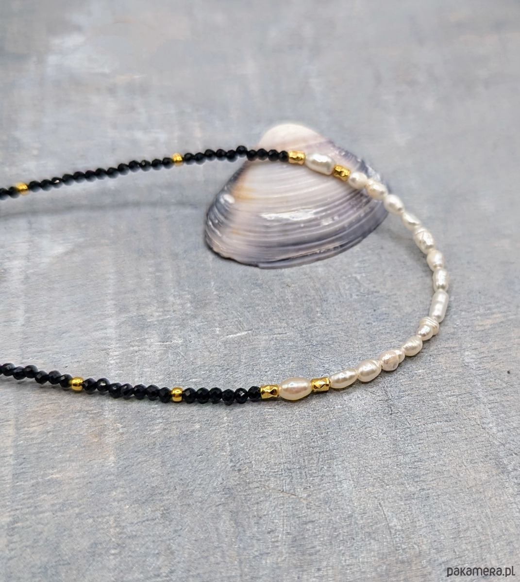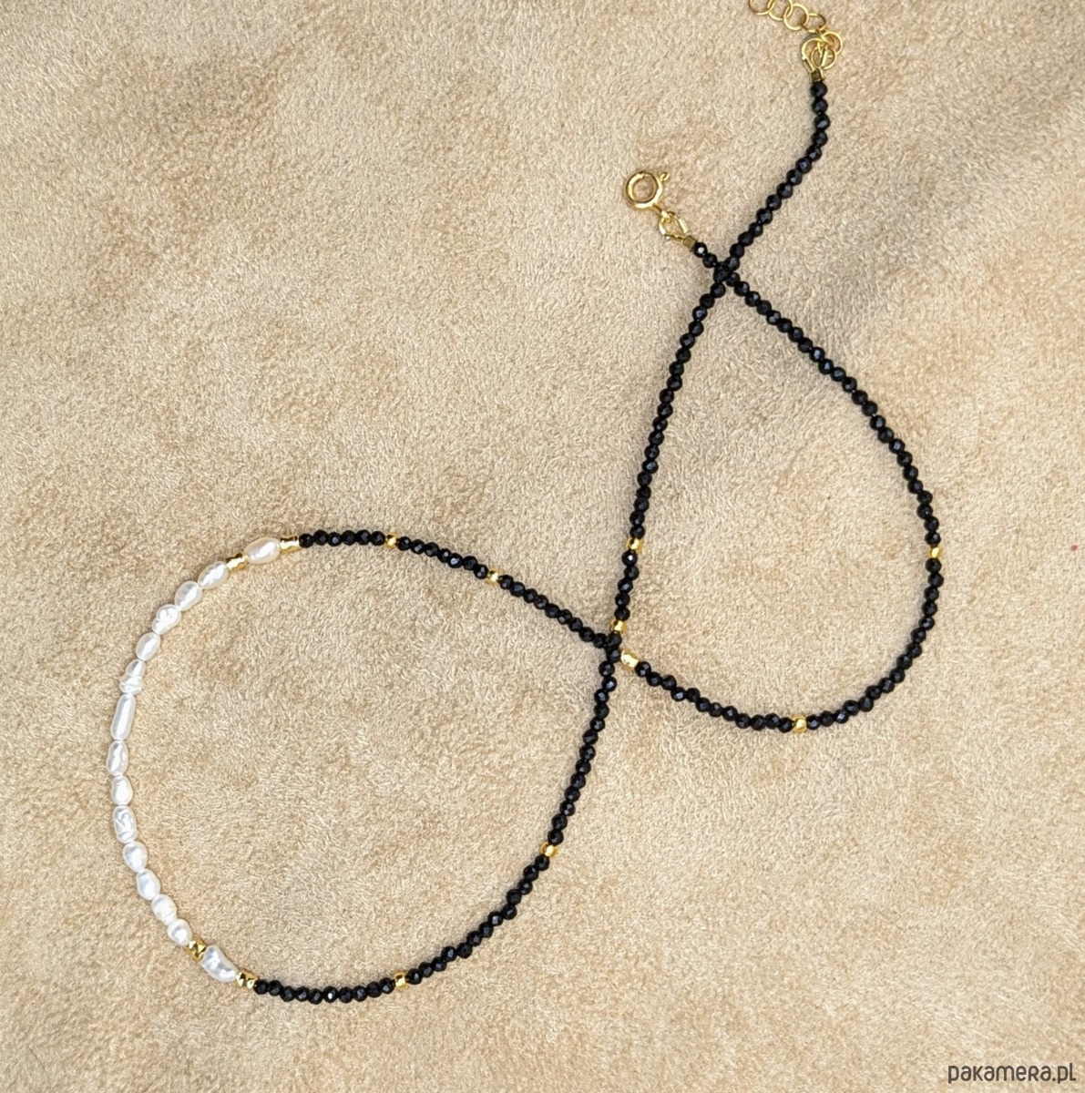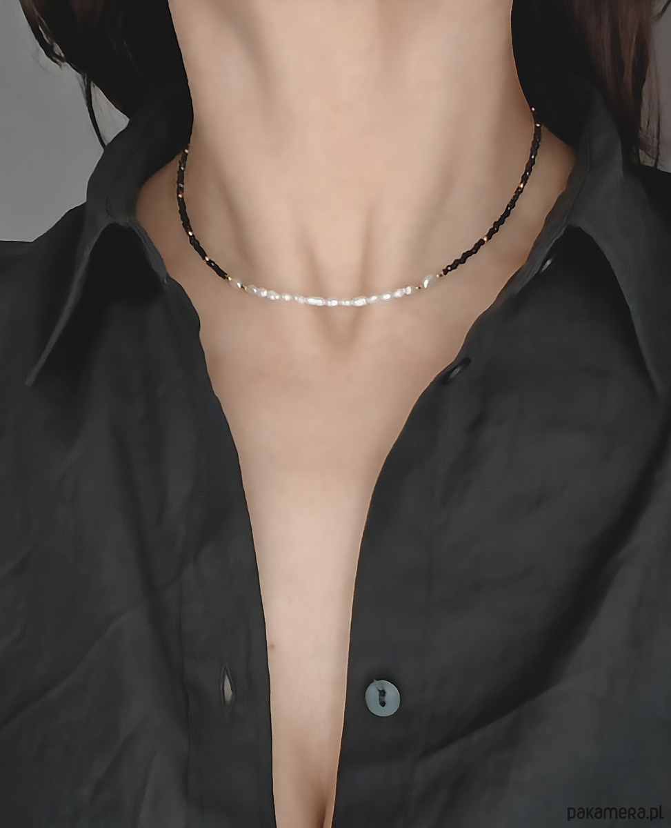 Klasyczny wzór - na wiele okazji, zarówno na co dzień, jak również do eleganckich stylizacji. Turmalin od lat jest pożądanym dodatkiem. Obok mistycznego czarnego koloru i pięknego blasku podobno ma właściwości ochronne. Dobrze komponuje się z drobnymi perełkami i stanowi modny dodatek. Idealny do noszenia samodzielnie jak również w połączeniu z inną biżuterią. Możliwość noszenia jako obróżka lub jako klasyczny naszyjnik. Wykończony pozłacanym srebrem.