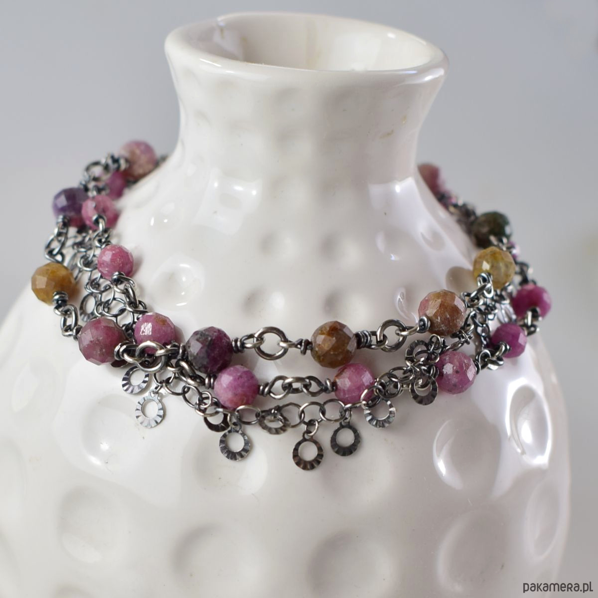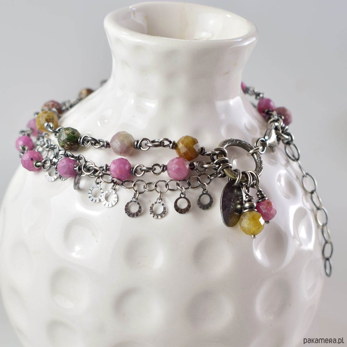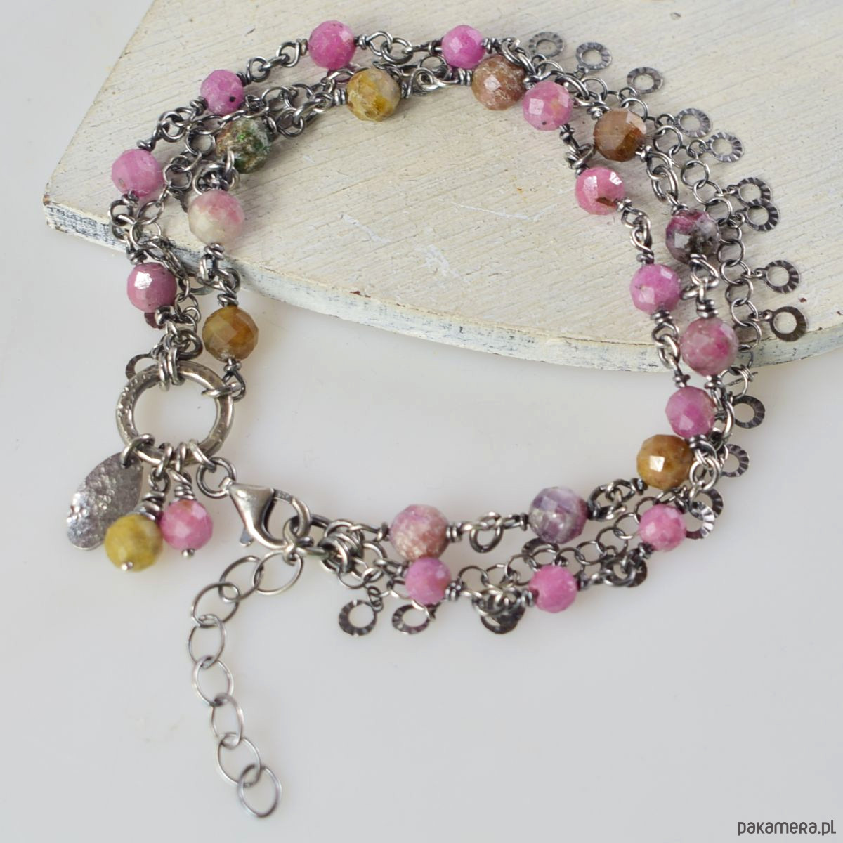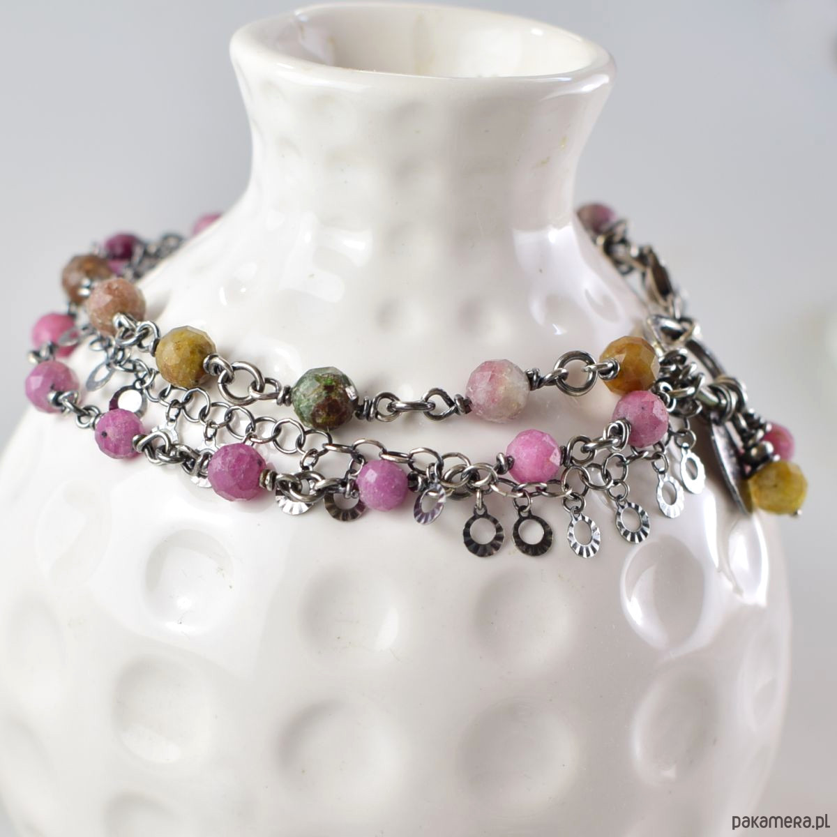Bransoletka wykonana w całości ze srebra (próba 925) z turmalinem i rubinem. Całość została zoksydowana (przyciemniona) i wypolerowana. Długość regulowana 20,5 - 24,5 cm. Biżuteria zostanie ozdobnie zapakowana.