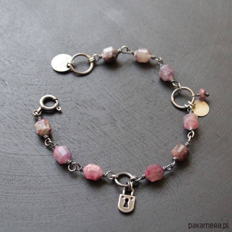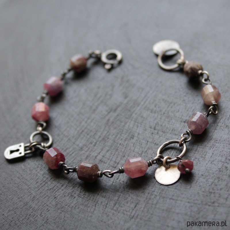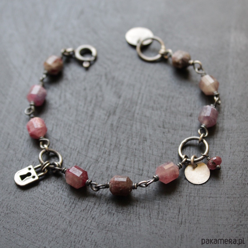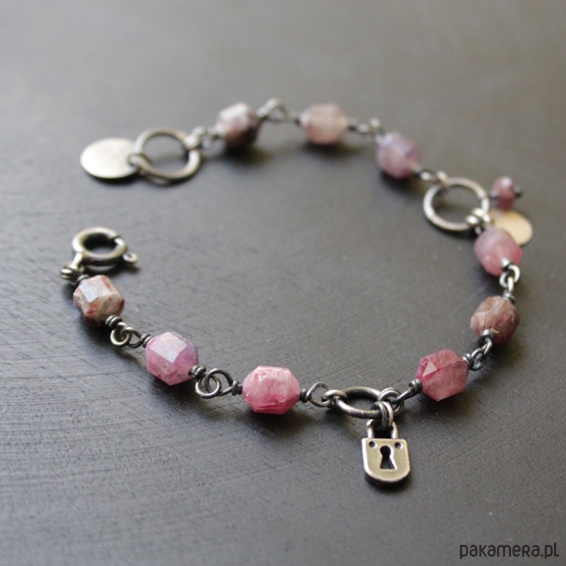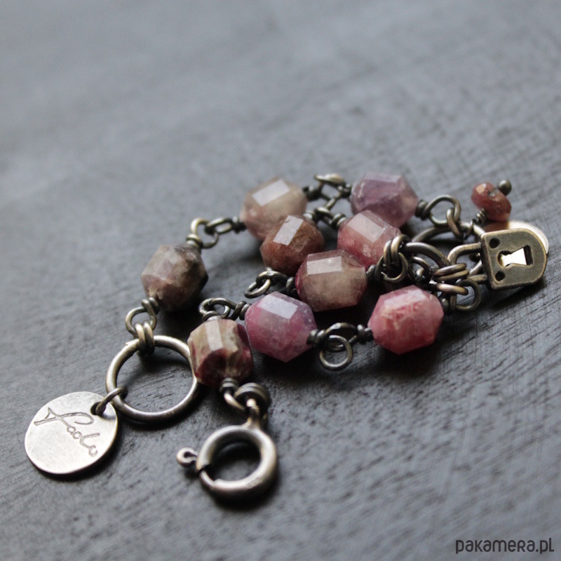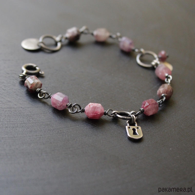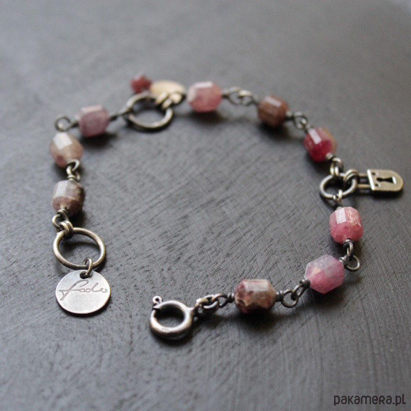 Bransoletka wykonana została z oksydowanego srebra próby 925, pięknych fasetowanych bryłek turmalinów w odcieniach różu (0,7-0,8 cm).