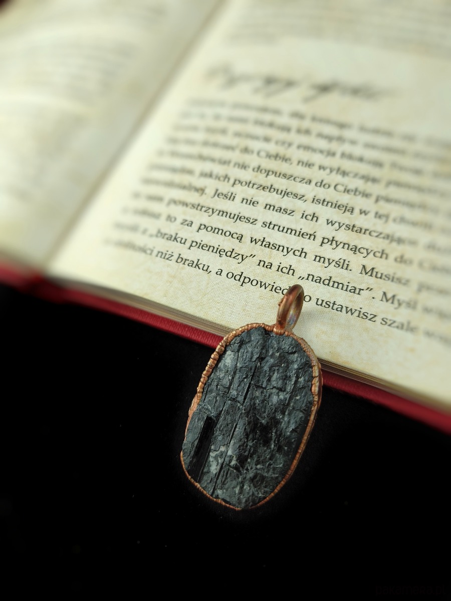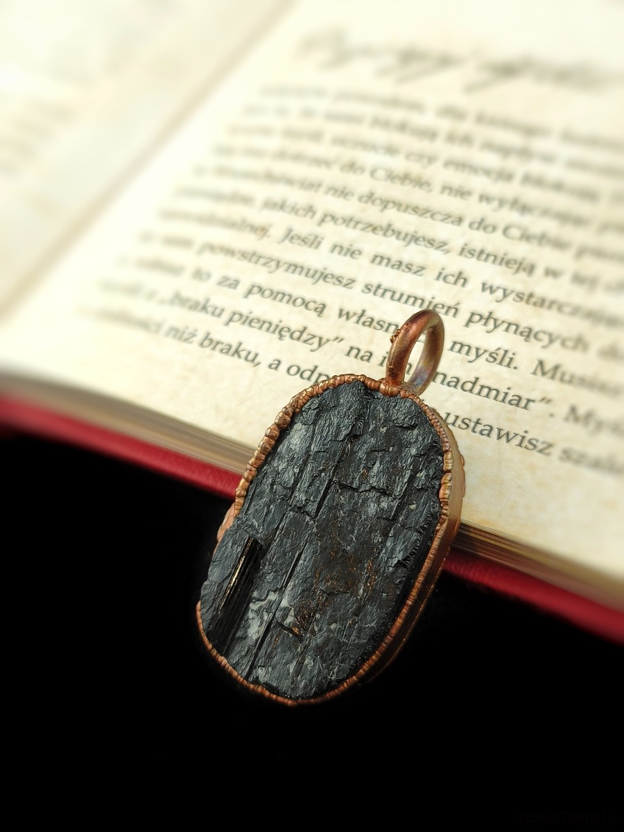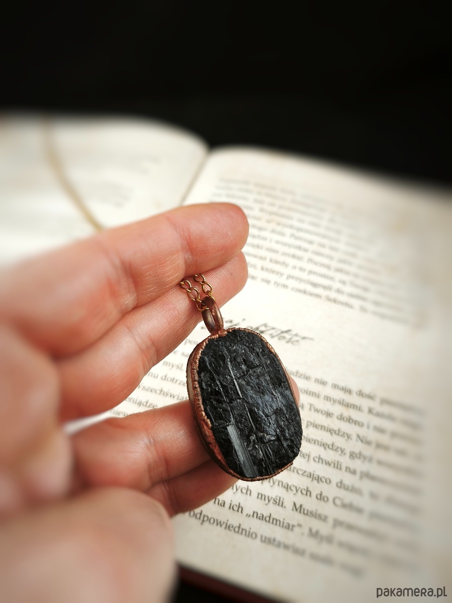 Turmalinowa Tarcza to wyjątkowy wisiorek, który powstał dzięki technice elektroformowania z miedzi i zawiera w sobie majestatyczny kaboszon surowego czarnego turmalinu.