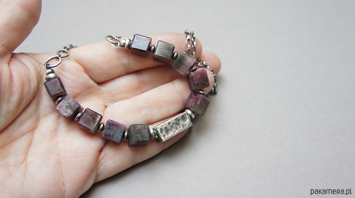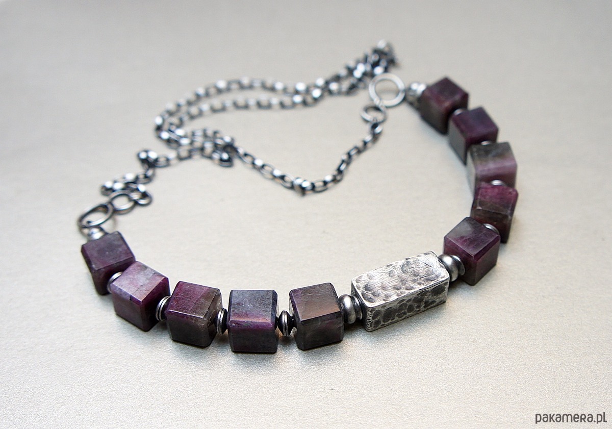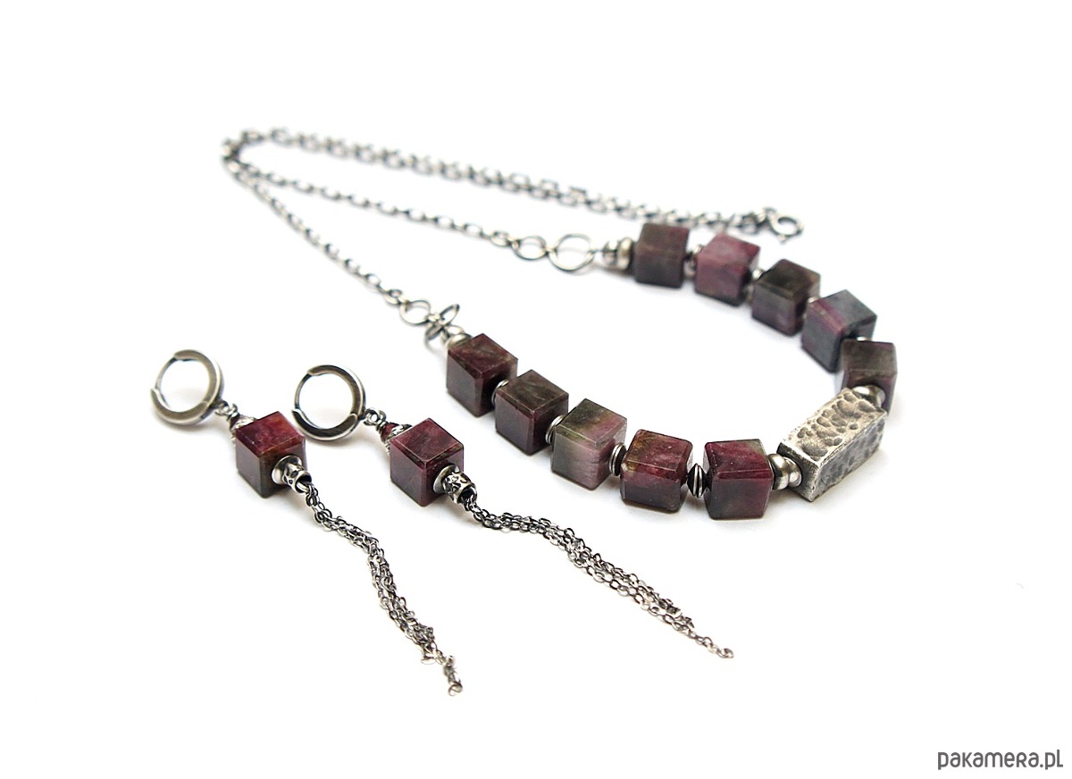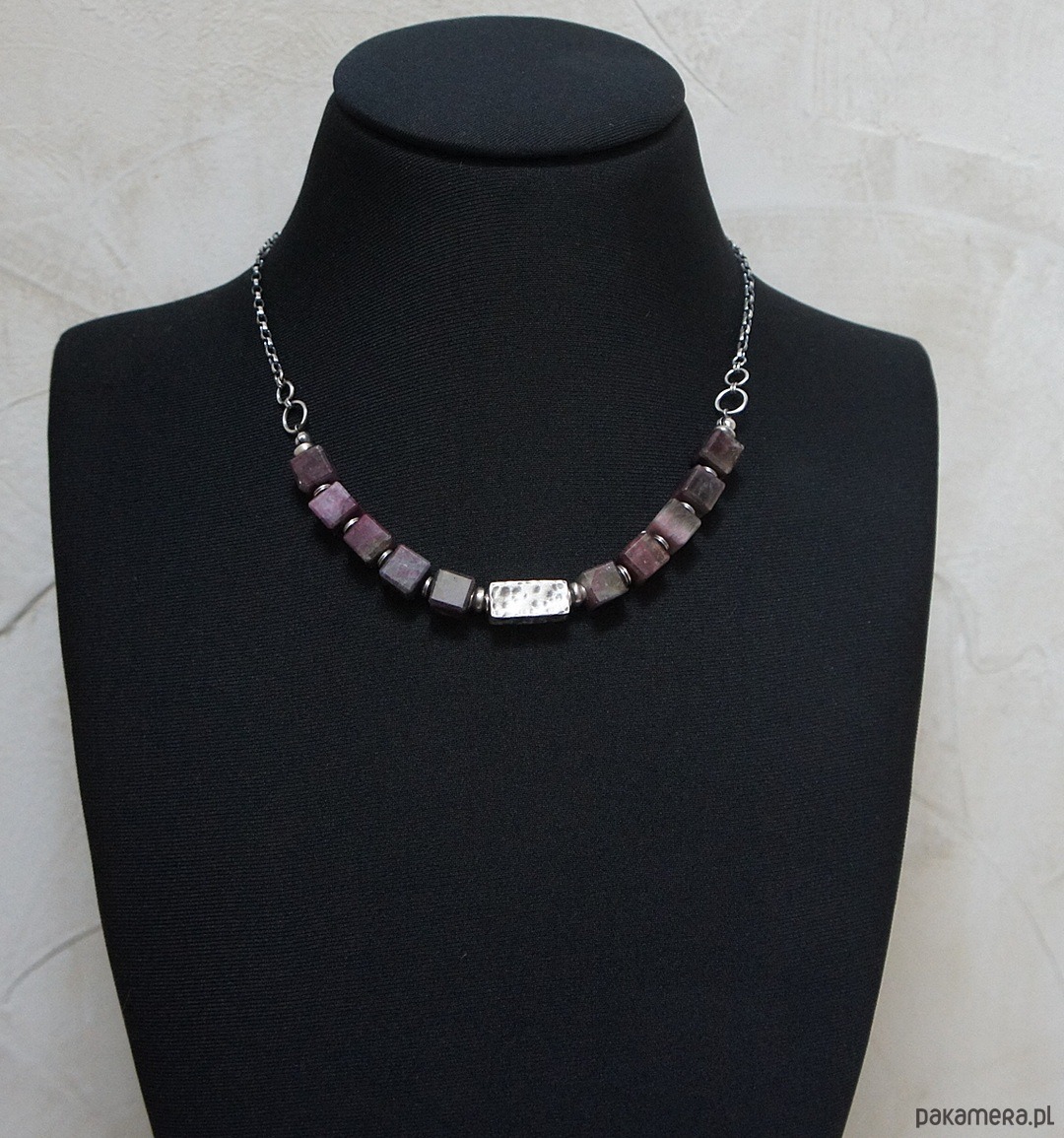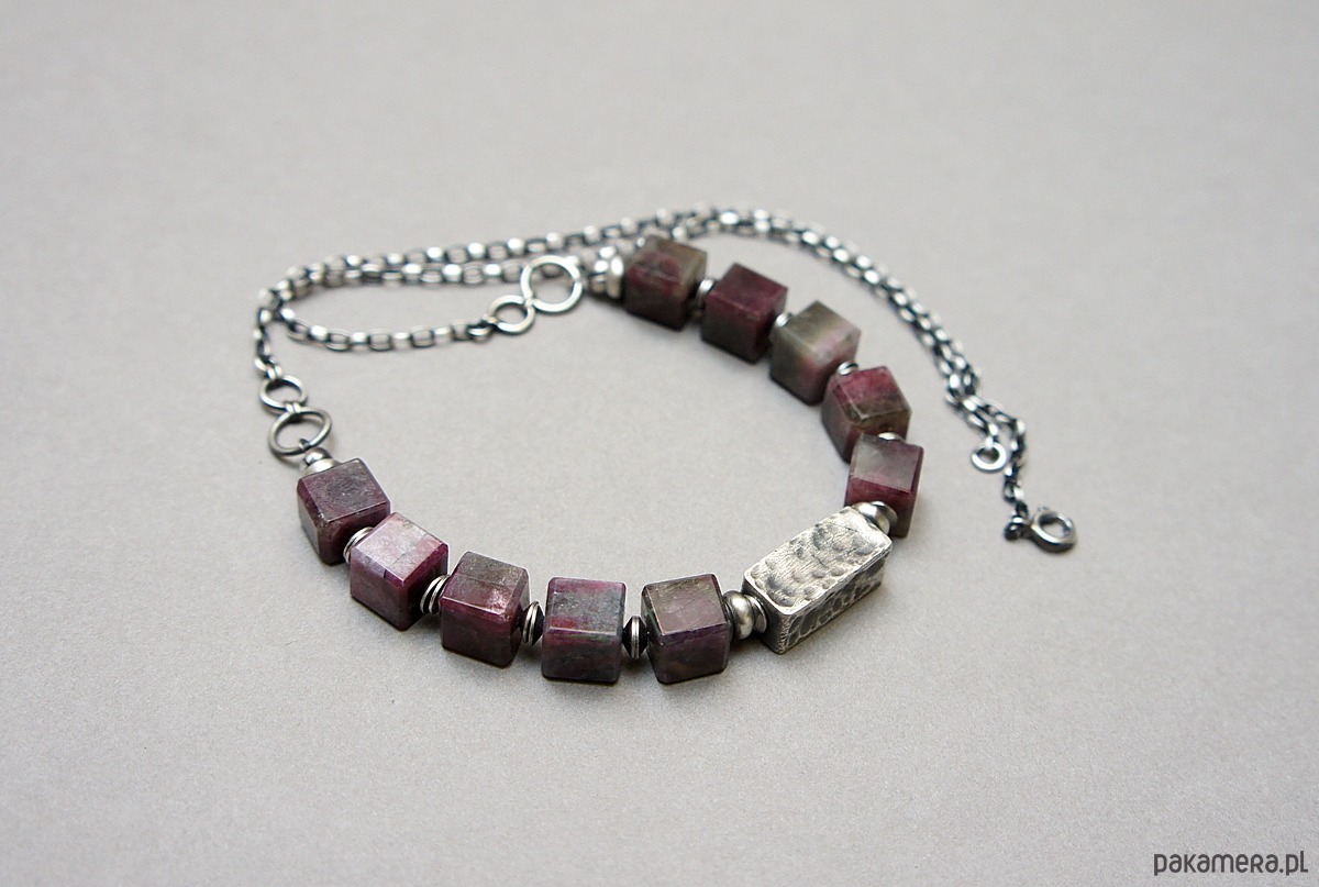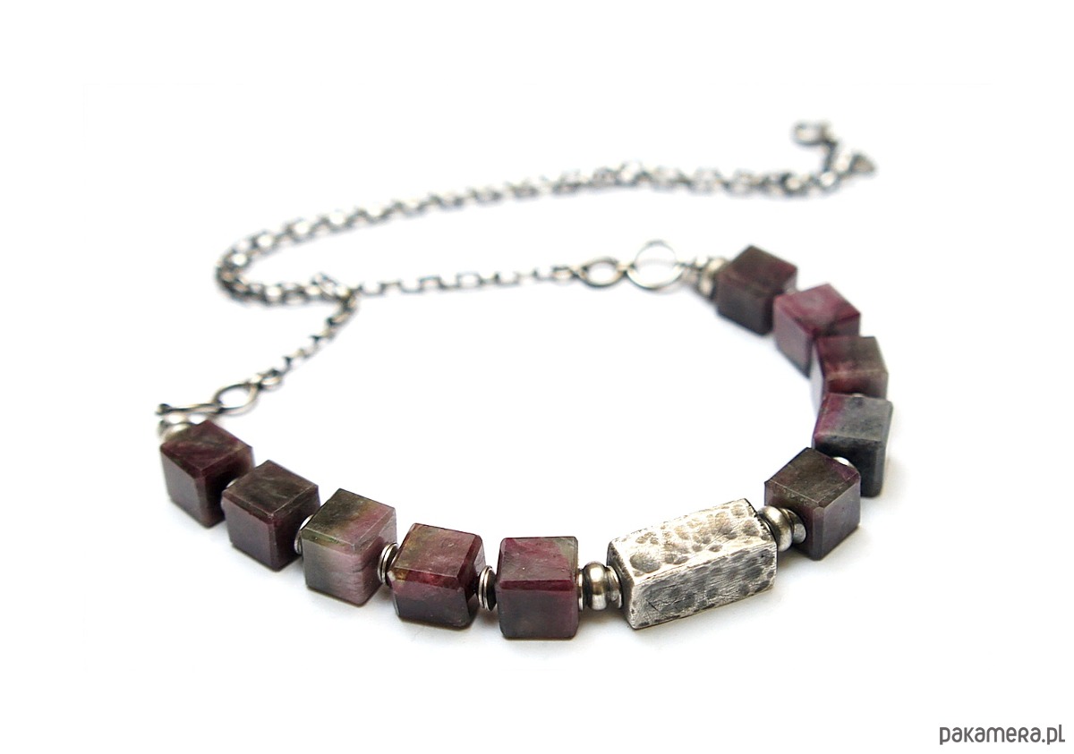 Naszyjnik wykonany od podstaw ze srebra [pr. 925] w połączeniu z wysokiej jakości unikatowymi kostkami turmalinów [8-9mm x 8-9mm w przeważającym bordowym kolorze ] oraz srebrną młotkowaną przekładką [22mm x9mm] . Srebro oksydowane i przetarte. Całkowita długość naszyjnika 51,5cm. Biżuteria ozdobnie zapakowana. Jedyny egzemplarz.