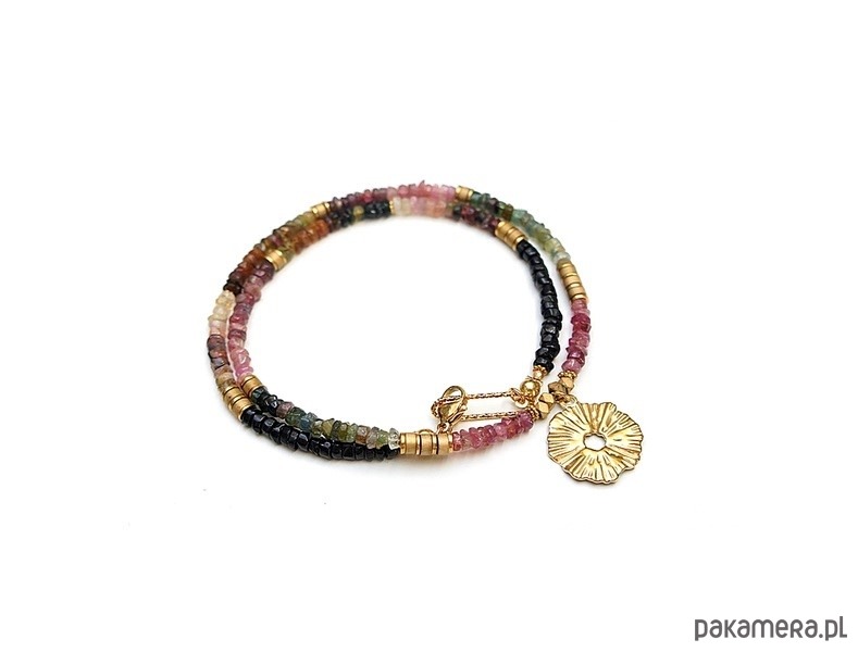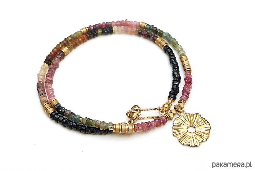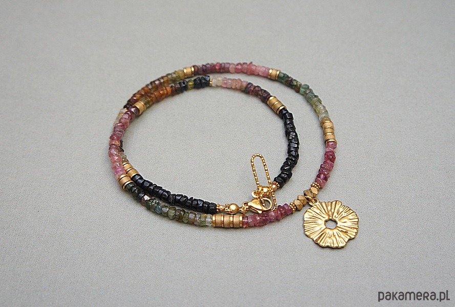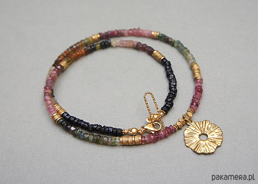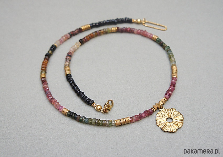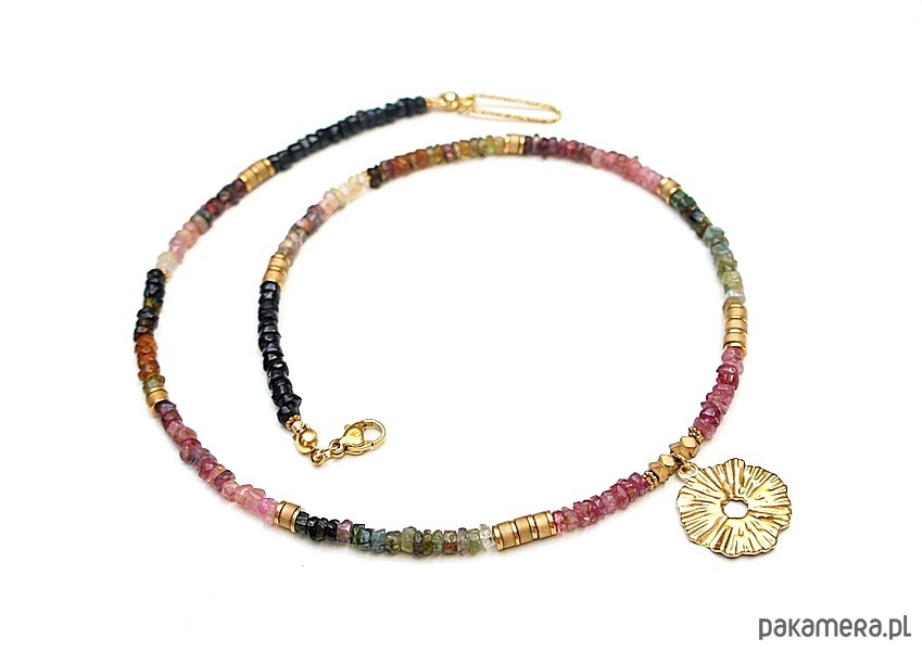 Krótki, delikatny naszyjnik wykonany w całości z pozłacanej stali szlachetnej oraz naturalnych, szlachetnych kamieni - nieregularnych talarków turmalinów [4 x 2mm], przekładek z hematytu [3 x 2mm oraz 4 x 2mm]. Naszyjnik o długości ok. 43cm.