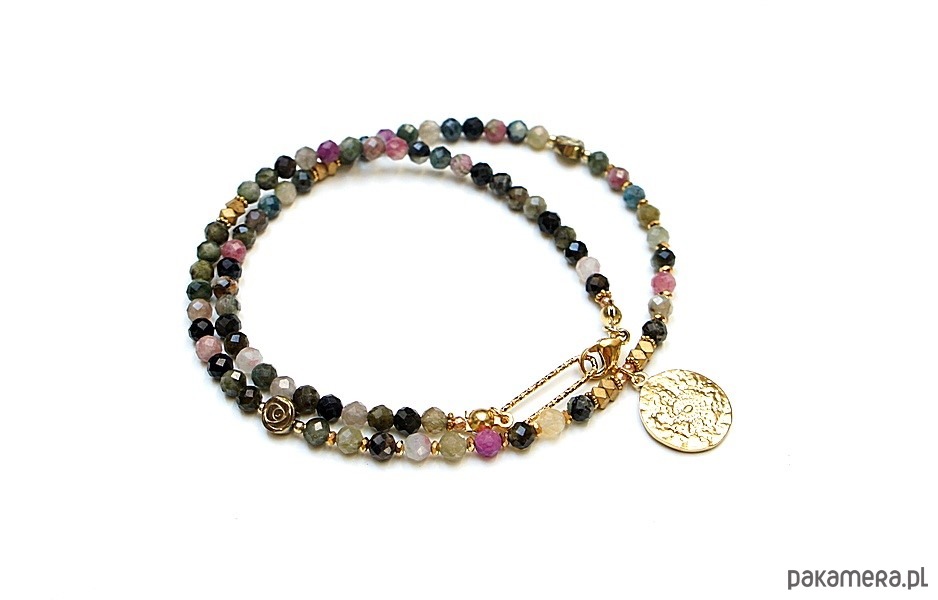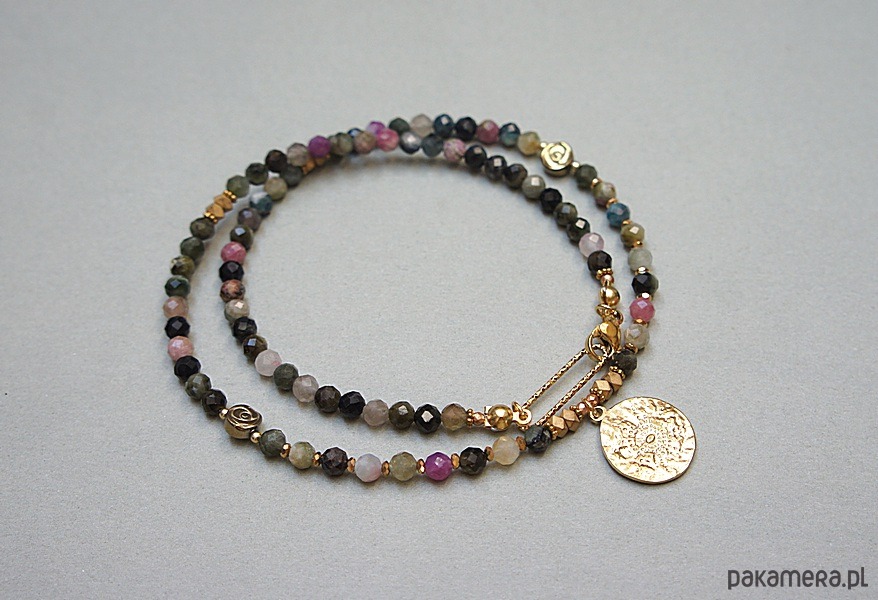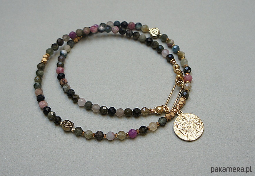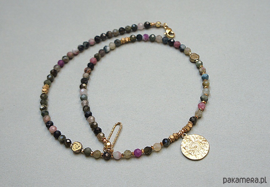 Krótki, delikatny naszyjnik wykonany w całości z pozłacanej stali szlachetnej oraz naturalnych, szlachetnych kamieni - fasetowanych turmalinów [4mm], przekładek z hematytu [1mm, 6mm oraz 3 x 2mm]. Naszyjnik o długości ok. 44,5cm.