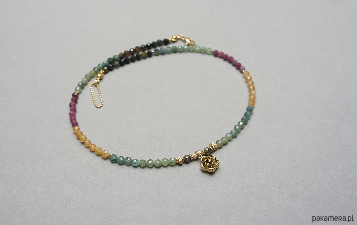 Krótki, delikatny naszyjnik wykonany w całości z pozłacanej stali szlachetnej oraz naturalnych, szlachetnych kamieni - fasetowanych turmalinów [4mm], fasetowanego pirytu o surowym wyglądzie [3,5mm], fasetowanego, platerowanego hematytu [3mm], przekładek z hematytu [1mm]. Naszyjnik o długości ok. 41cm.