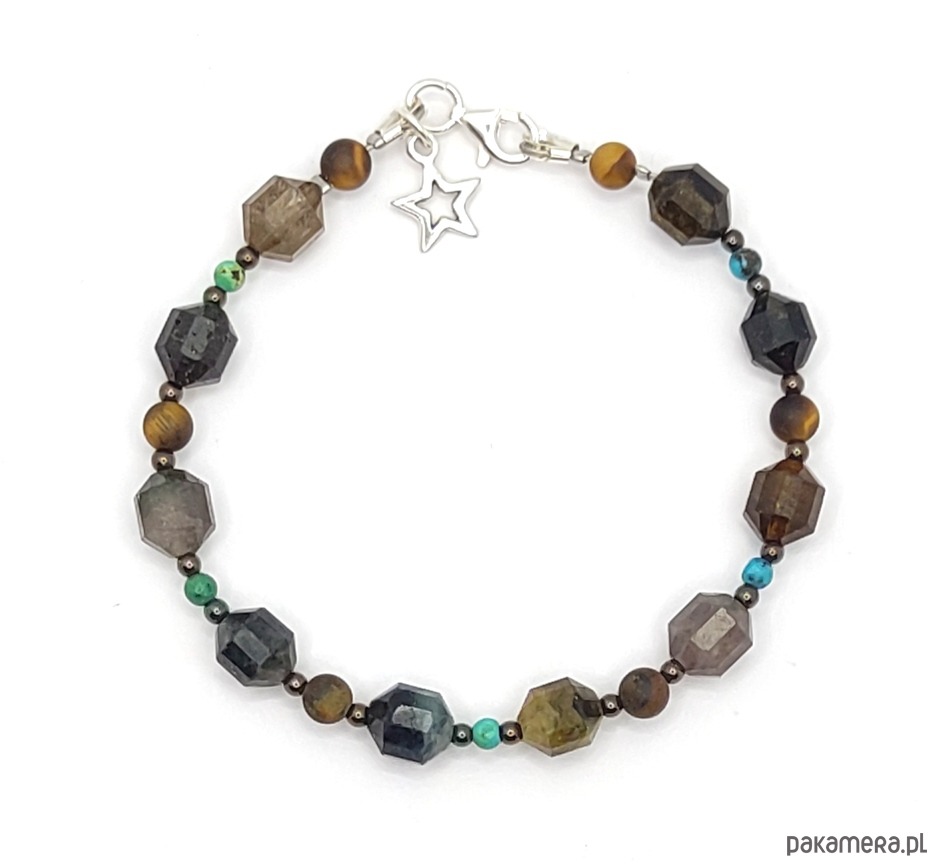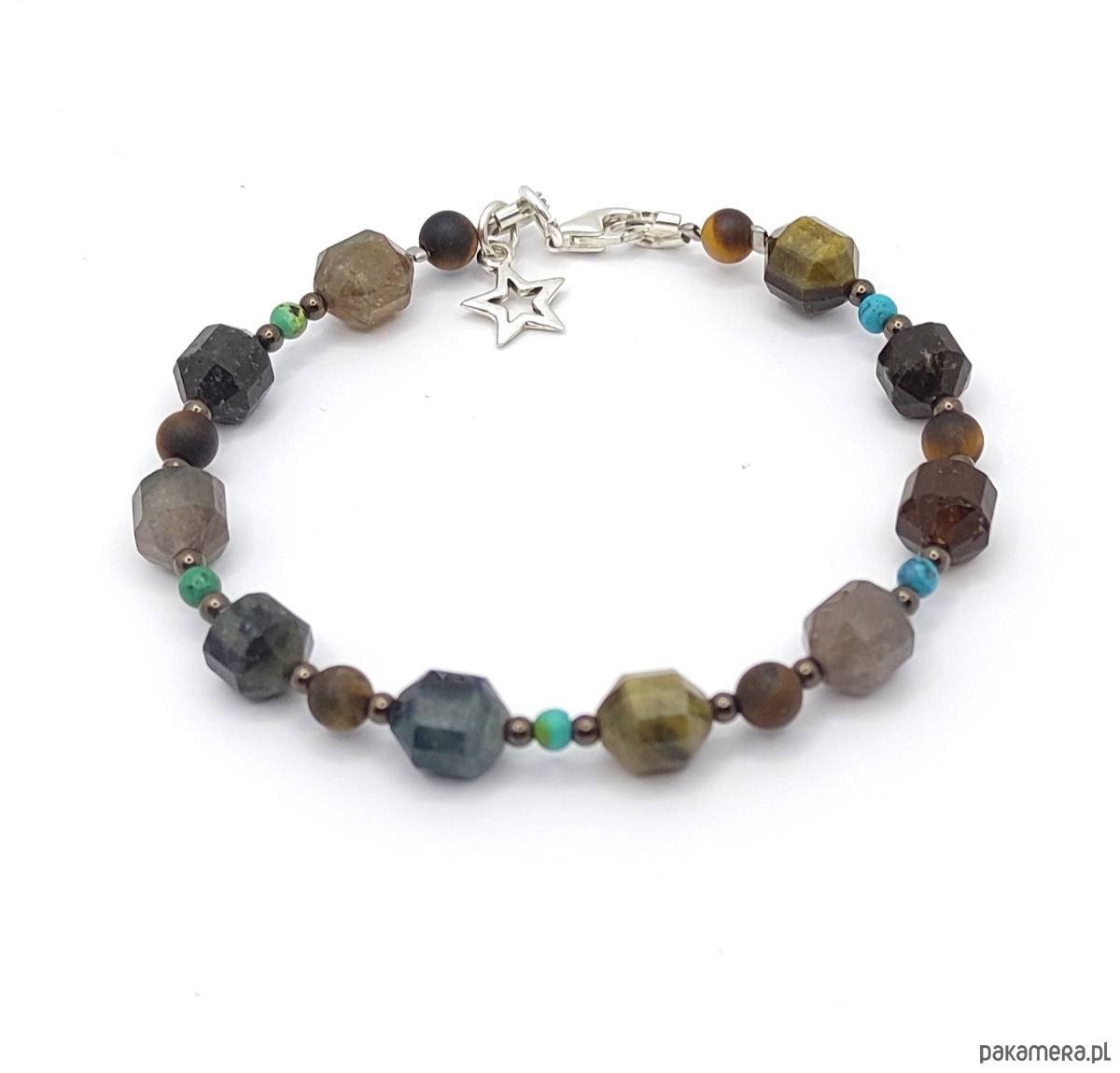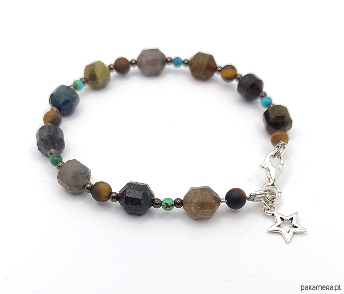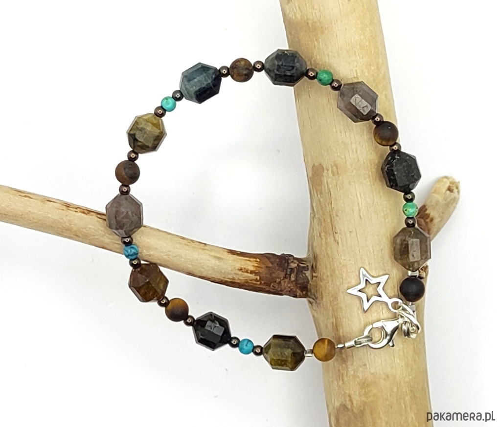 Bransoletka wykonana z dużych bryłek turmalinu oraz drobnych kulek tygrysiego oka i turkusu. Turmaliny są grubo oszlifowane, dość surowe, ładnie błyszczące. Kolorystyka bliska naturze: różne odcienie brązu, szarości,zieleni i niebieskiego. Przy zapięciu znajduje się srebrna zawieszka gwiazdka. Ciekawa, wyrazista, inna niż wszystkie.