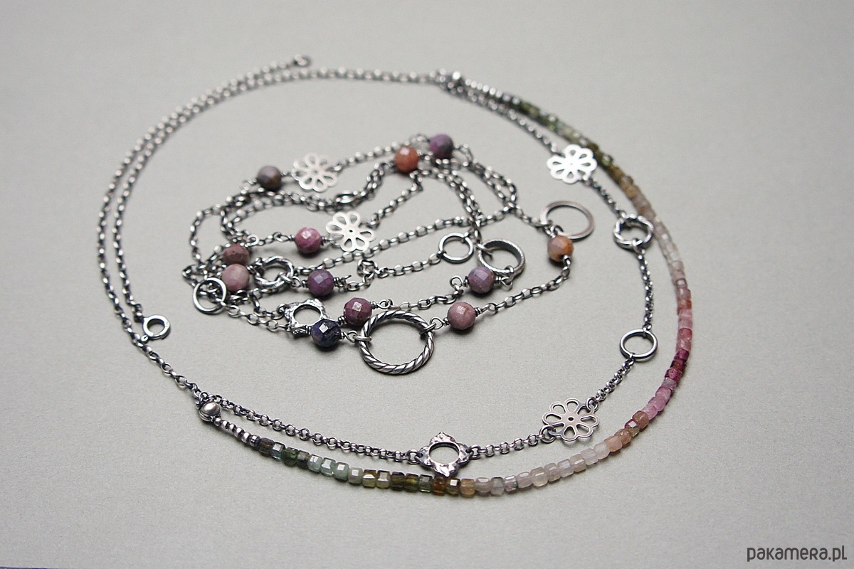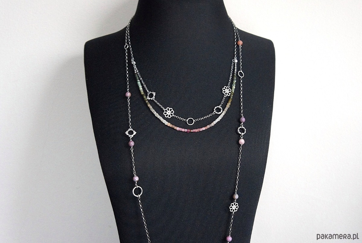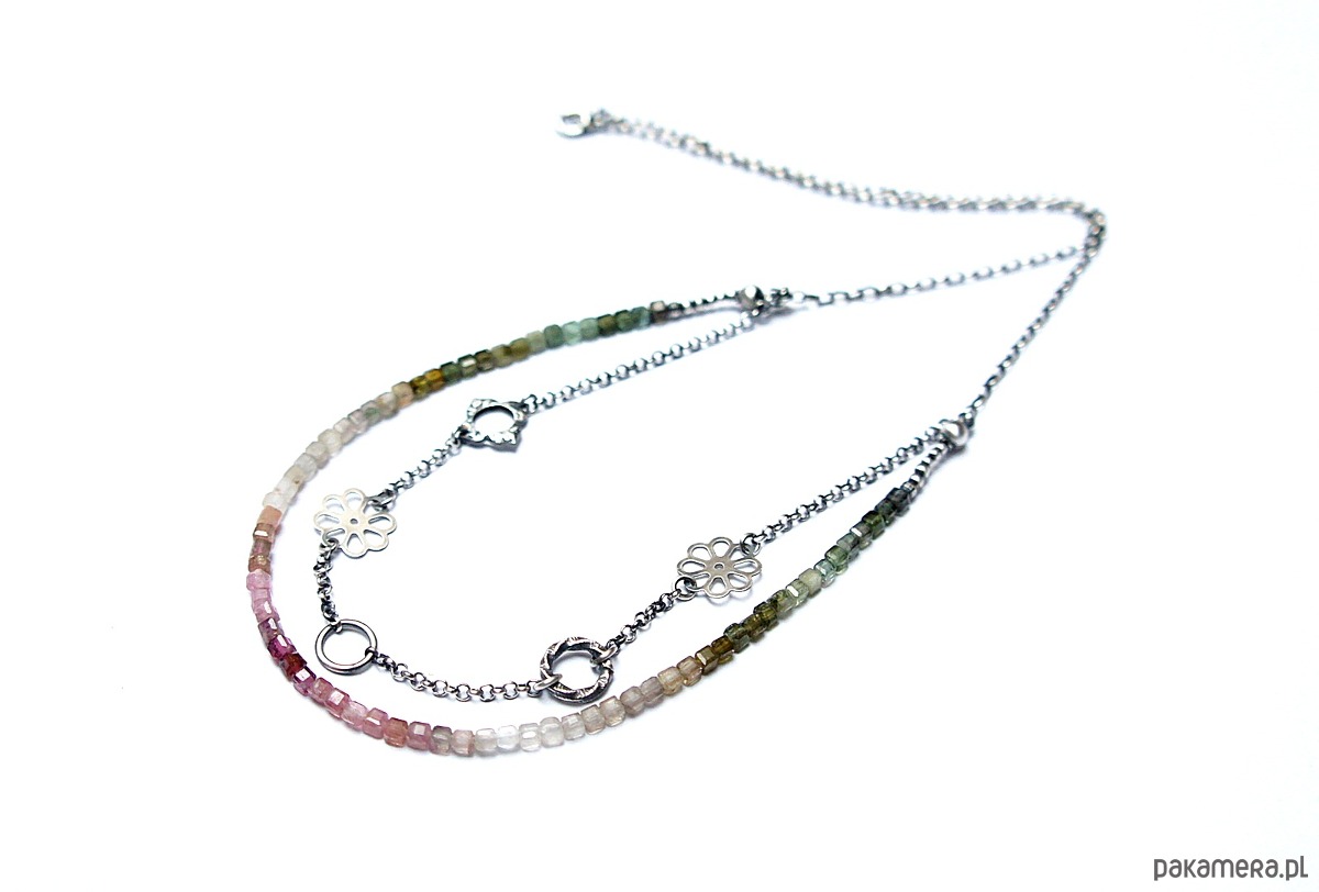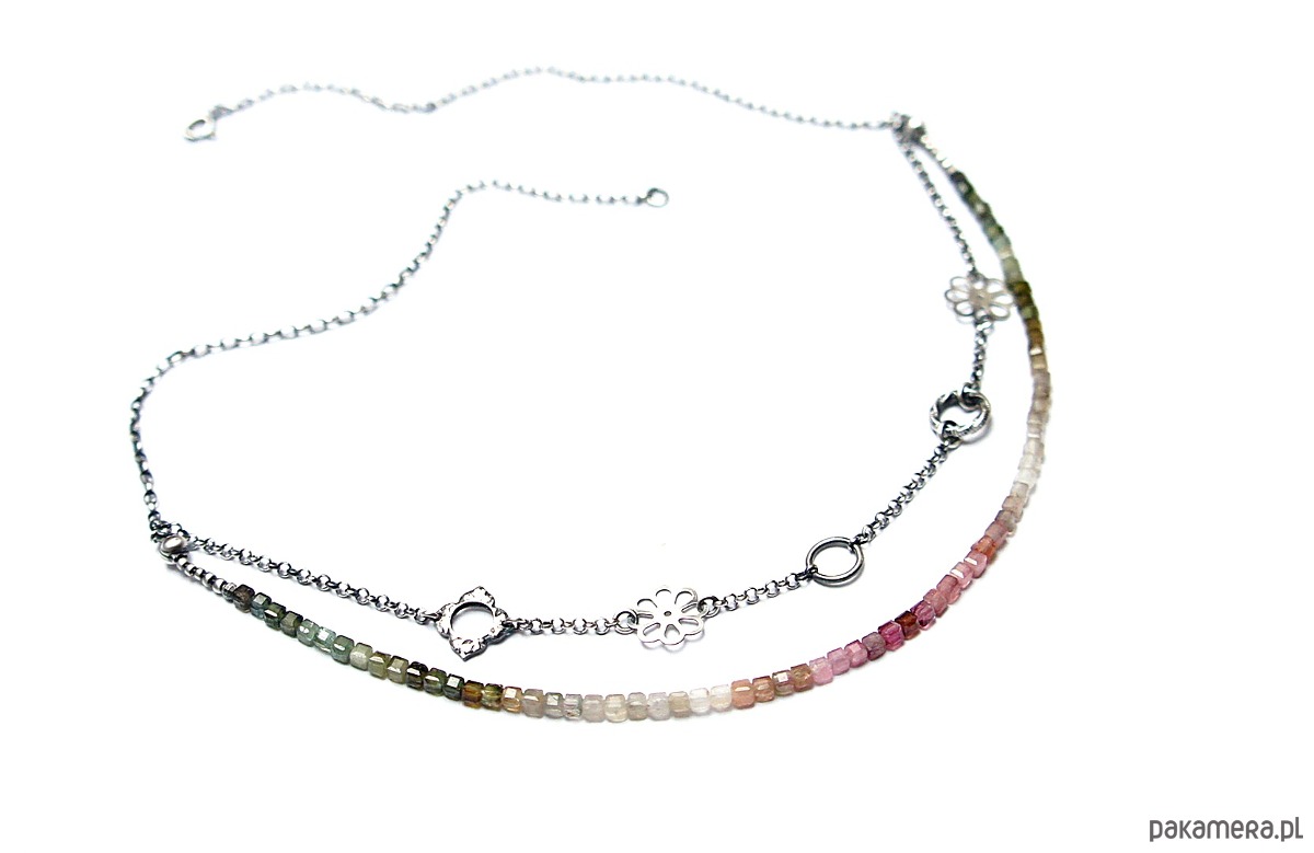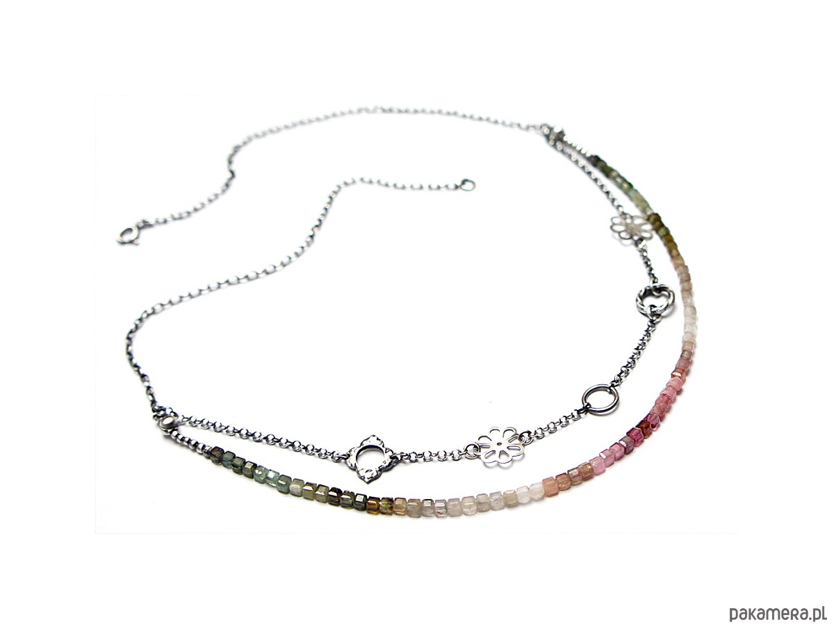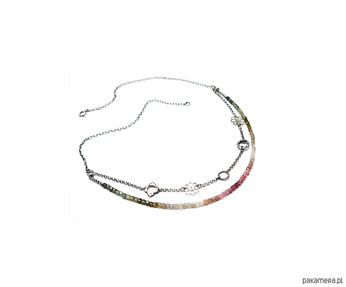 Naszyjnik dwurzędowy wykonany ze srebra [pr.925] w połączeniu z kostkami turmalinów [ok. 4mm] oraz srebrnymi kwiatuszkami i kółeczkami. Całość oksydowana i przetarta. Całkowita długość naszyjnika po dłuższym obwodzie 53,5cm. Biżuteria ozdobnie zapakowana.