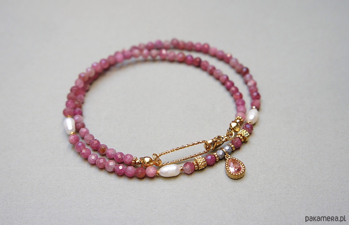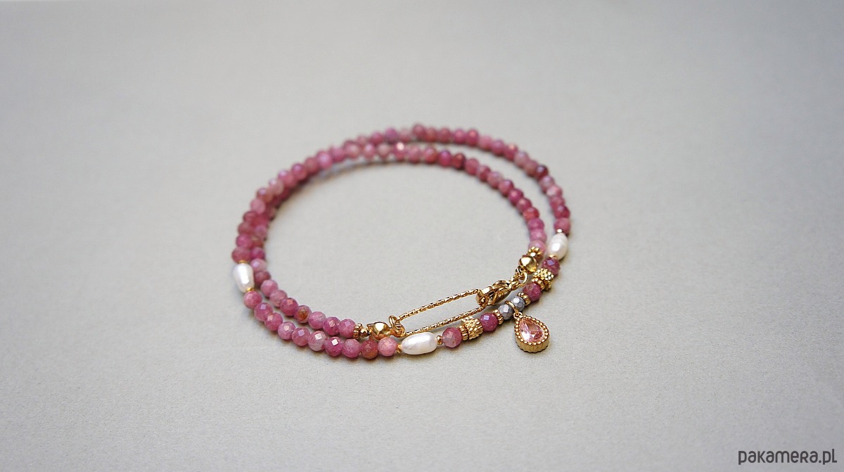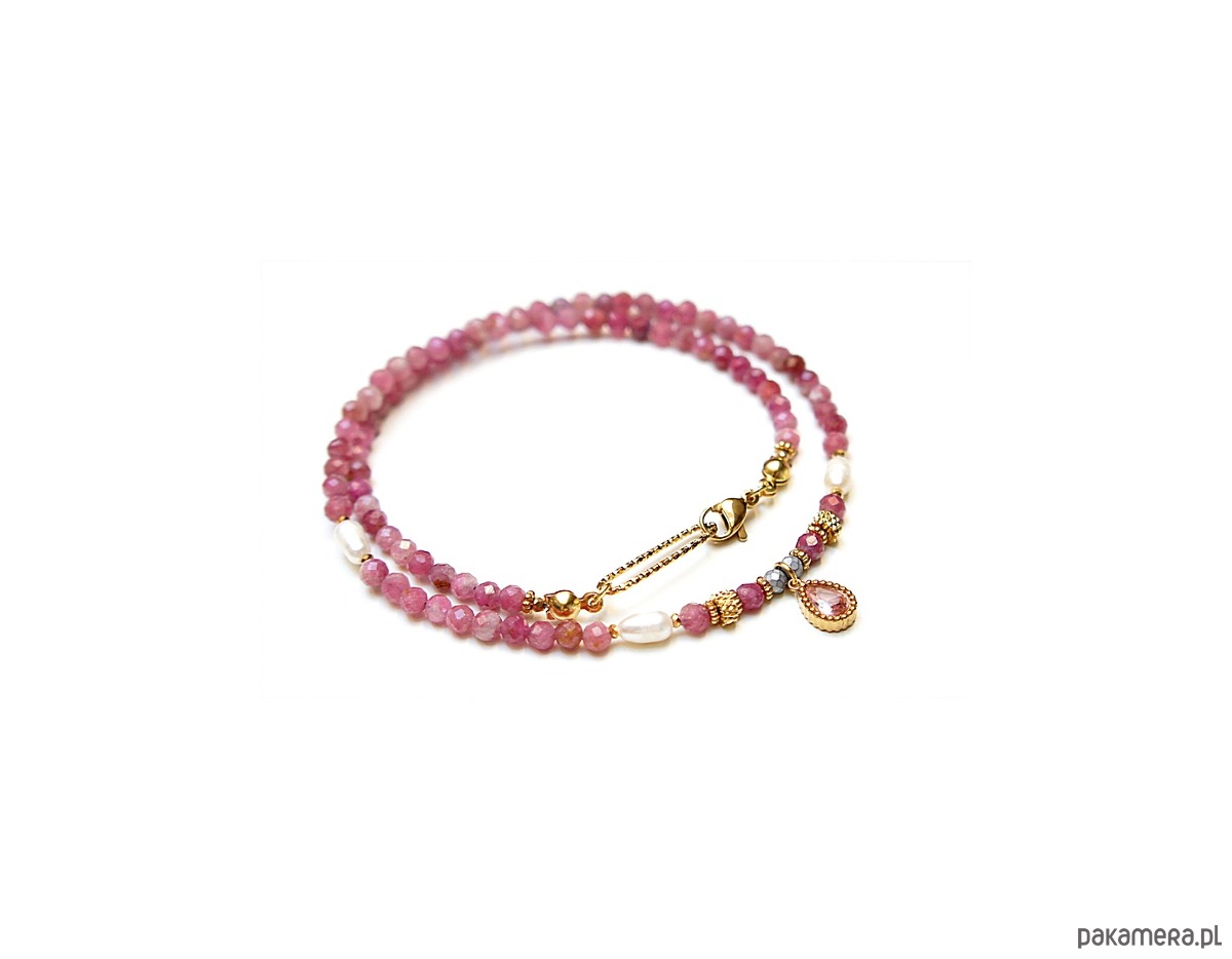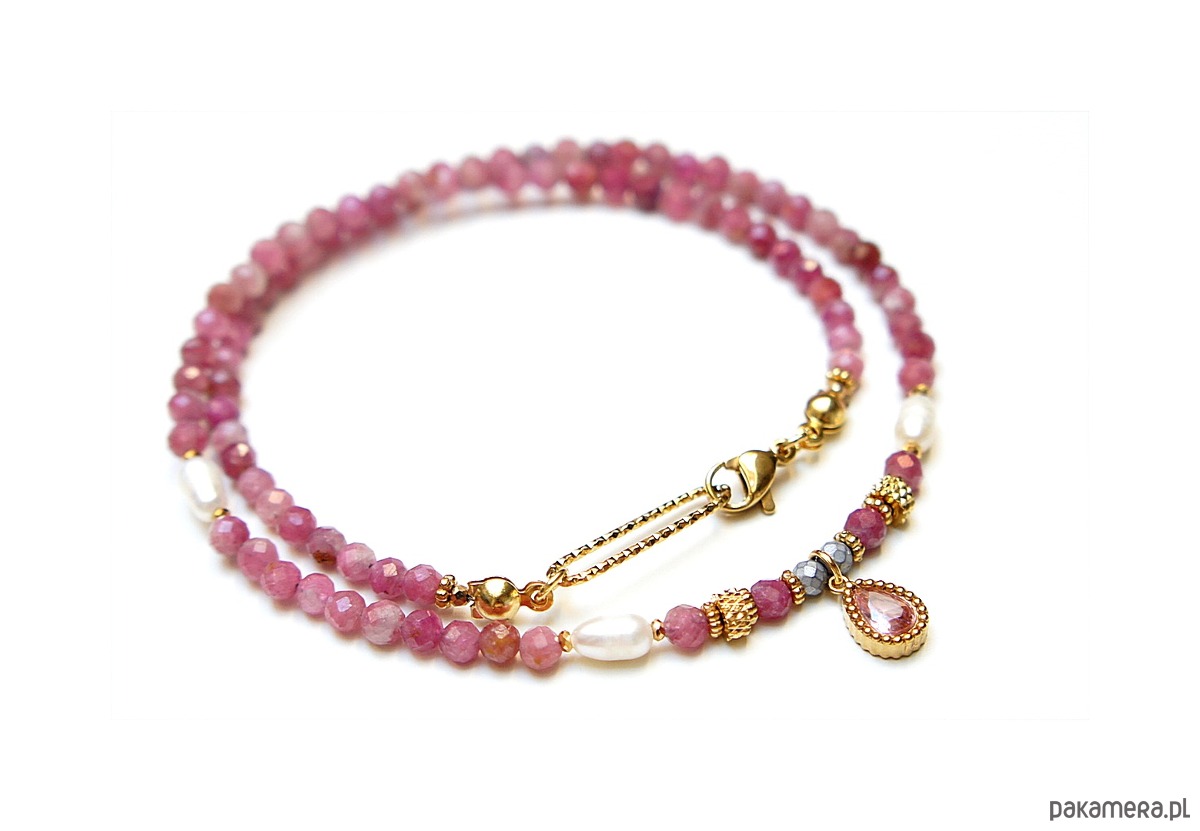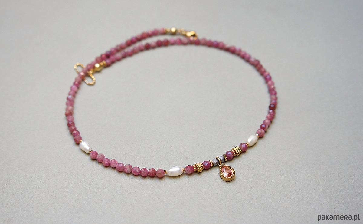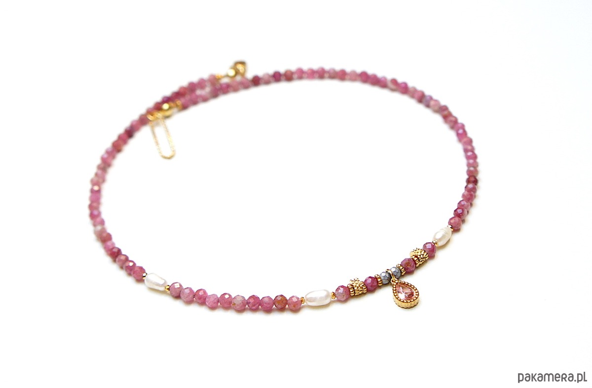 Krótki, delikatny naszyjnik wykonany w całości z pozłacanej stali szlachetnej oraz naturalnych, szlachetnych kamieni - fasetowanych, różowych turmalinów [ok. 3mm], przekładek z hematytu [1mm], hematytu fasetowanego, matowego [2mm], pereł naturalnych [ok. 6mm] oraz zawieszki z cyrkonią w okuciu. Naszyjnik o długości ok. 41cm.