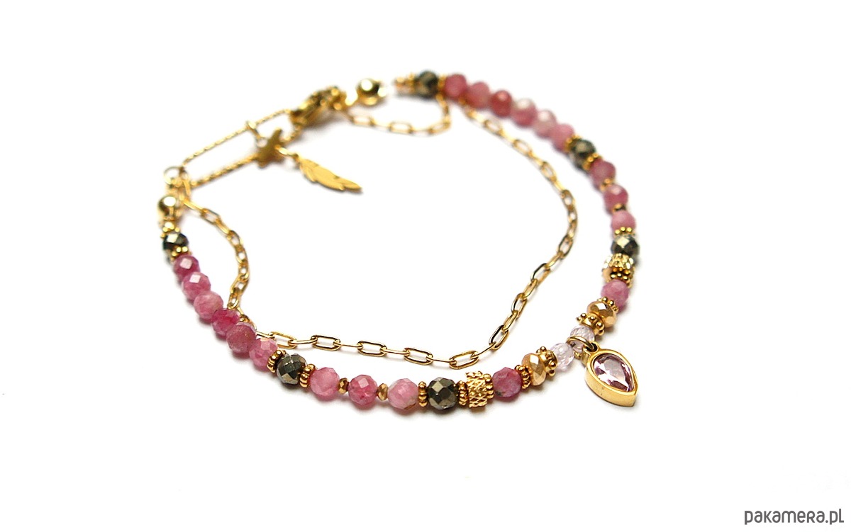 Delikatna bransoletka wykonana w całości ze stali szlachetnej pozłacanej, szlachetnych kamieni - turmalinów fasetowanych [4mm], pirytu fasetowanego o surowej strukturze [4mm], cyrkonii fasetowanych [2mm], hematytu fasetowanego, platerowanego [3 x 2mm oraz 2mm], przekładek z hematytu [1mm] oraz zawieszki z cyrkonią w okuciu. Całkowita długość bransoletki 18,5cm. Biżuteria ozdobnie zapakowana.