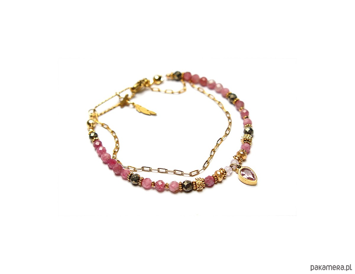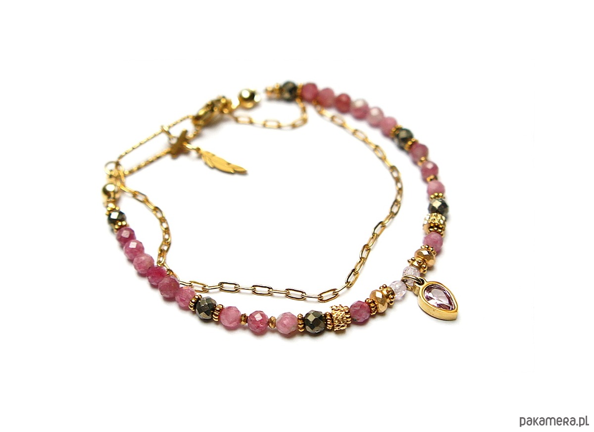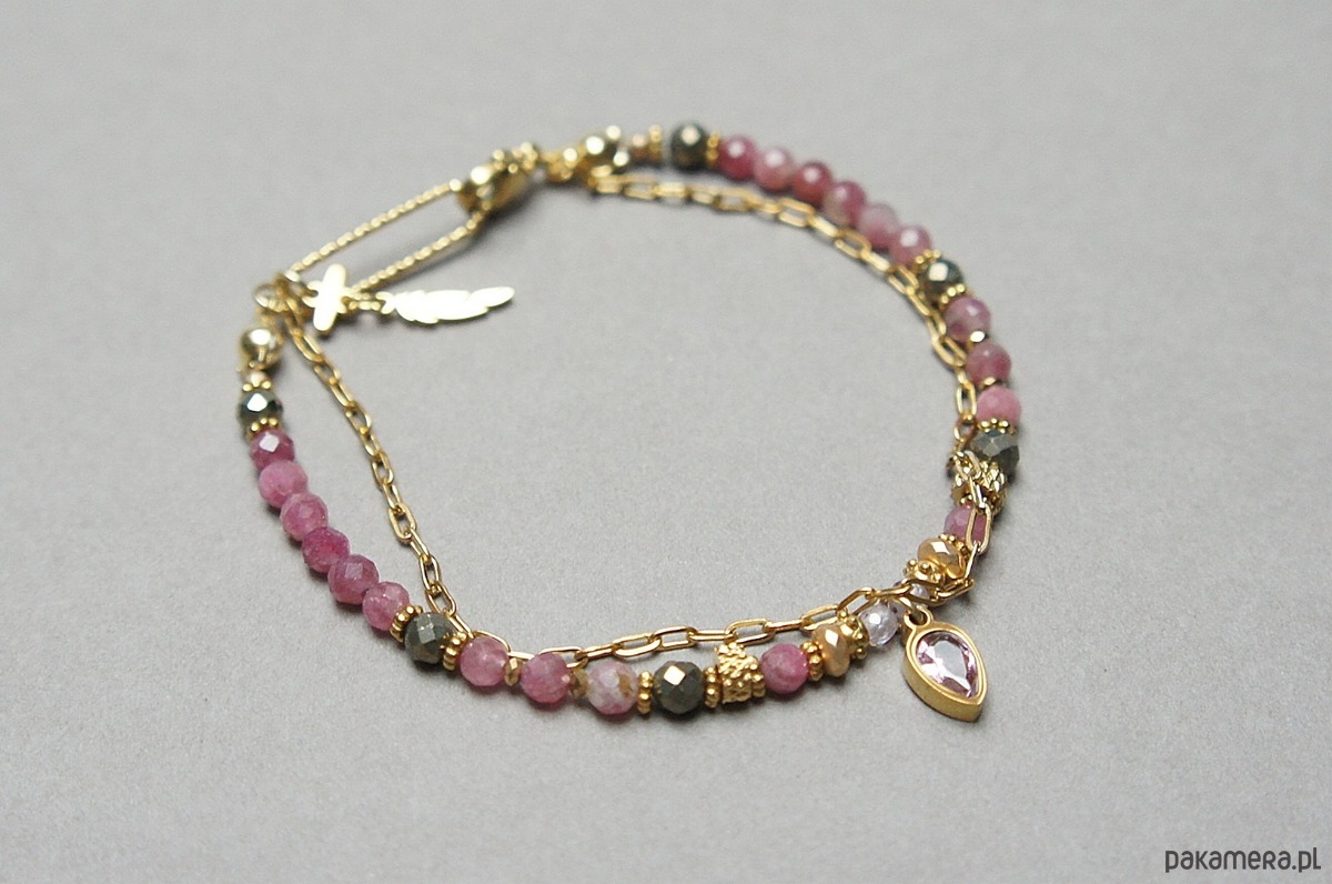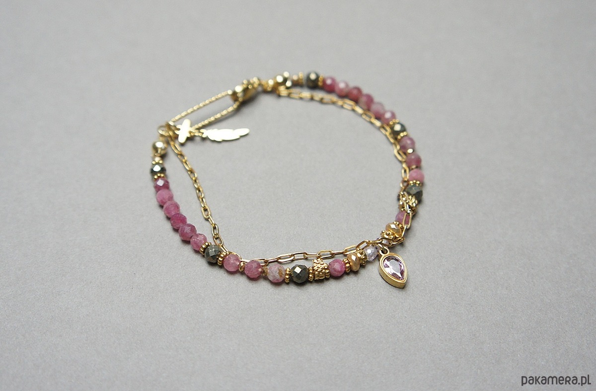 Delikatna bransoletka wykonana w całości ze stali szlachetnej pozłacanej, szlachetnych kamieni - turmalinów fasetowanych [4mm], pirytu fasetowanego o surowej strukturze [4mm], cyrkonii fasetowanych [2mm], hematytu fasetowanego, platerowanego [3 x 2mm oraz 2mm], przekładek z hematytu [1mm] oraz zawieszki z cyrkonią w okuciu. Całkowita długość bransoletki 18,5cm. Biżuteria ozdobnie zapakowana.