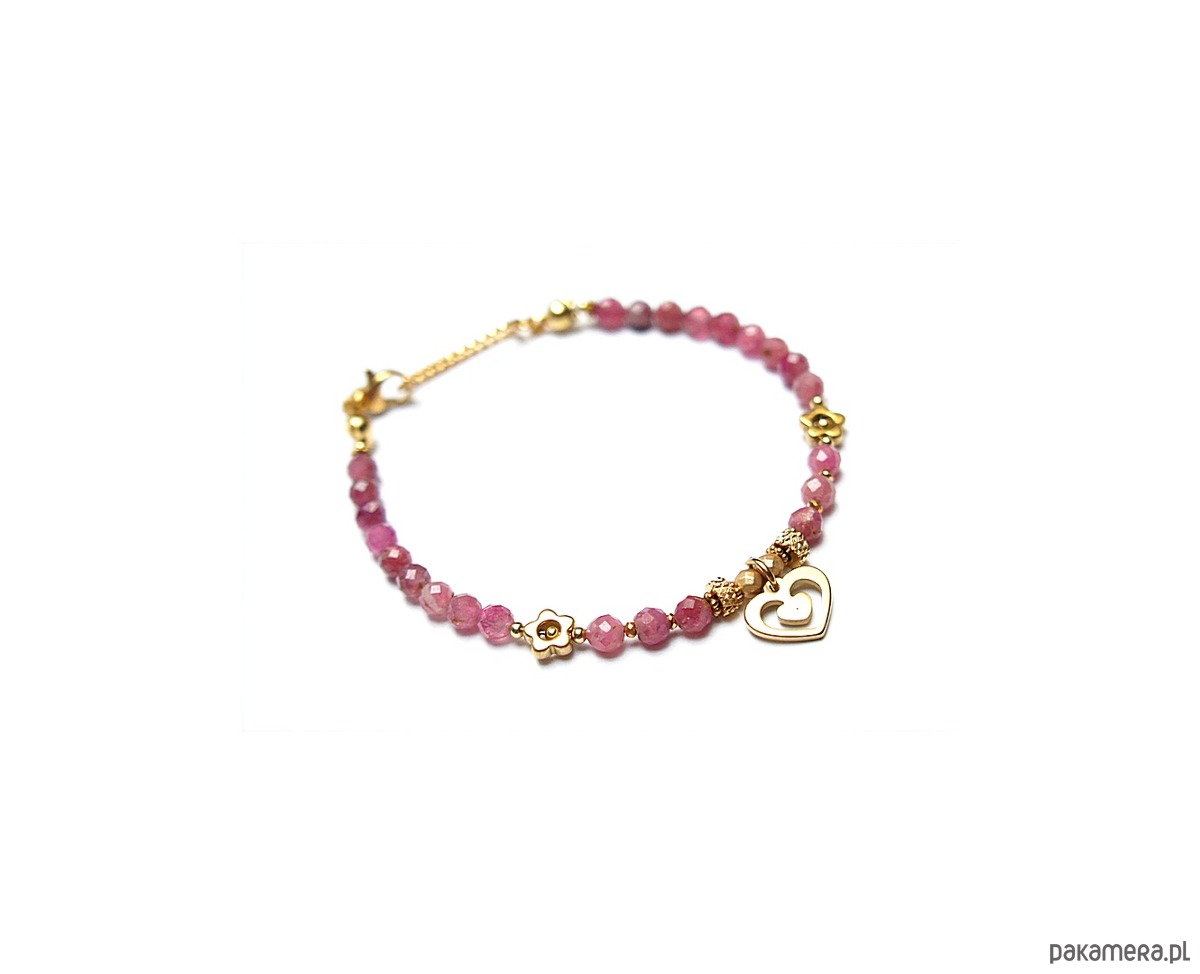 Prace datowane. Delikatna bransoletka wykonana w całości ze stali szlachetnej pozłacanej, szlachetnych kamieni - turmalinów fasetowanych [4mm], hematytu fasetowanego, platerowanego [3mm], przekładek z hematytu [1mm oraz 6mm - kwiatki]. Bransoletka o długości 19cm. Biżuteria ozdobnie zapakowana.