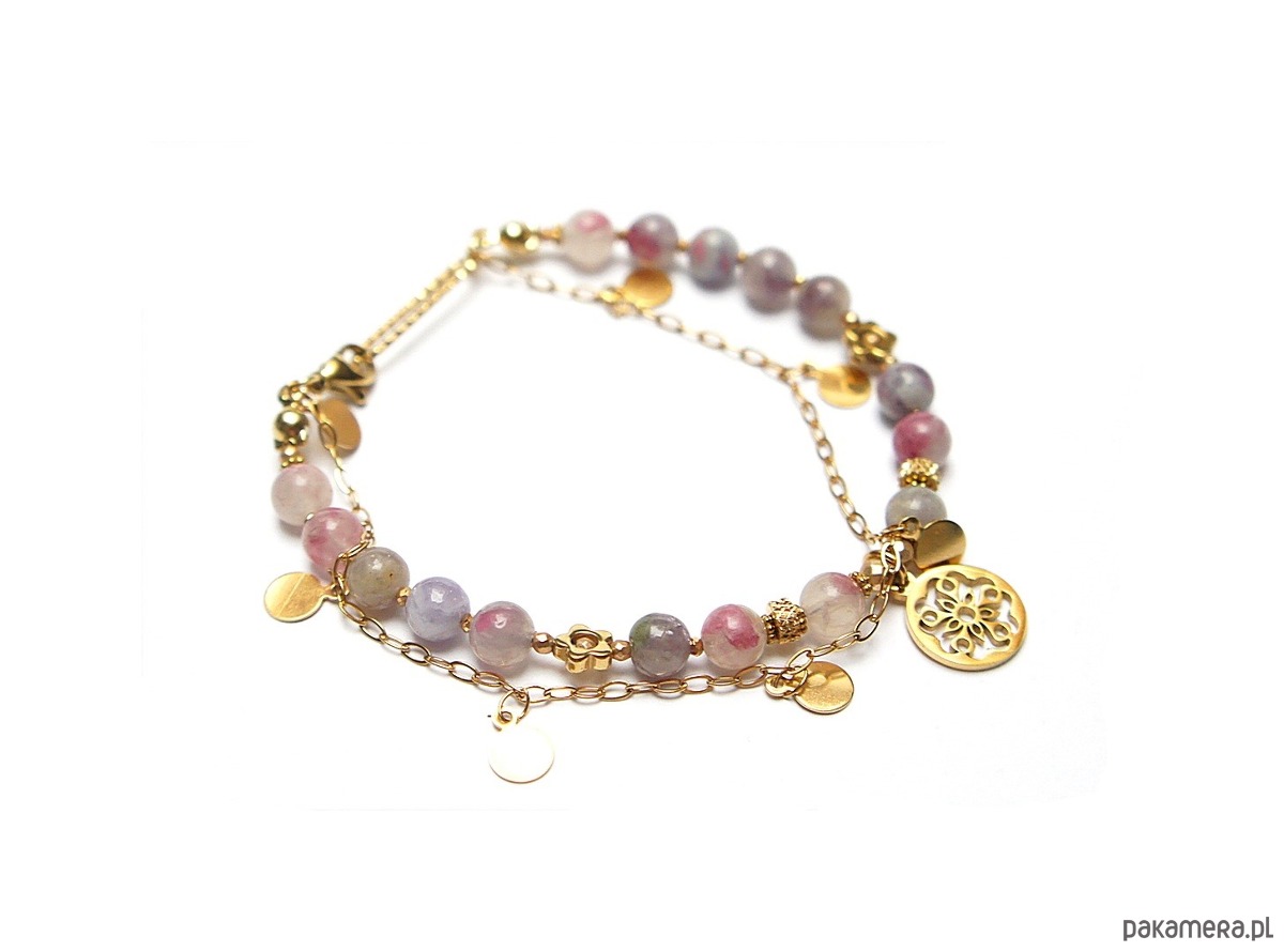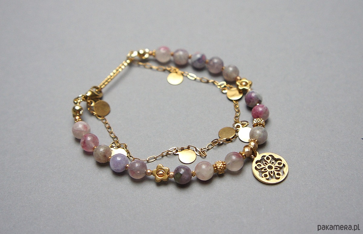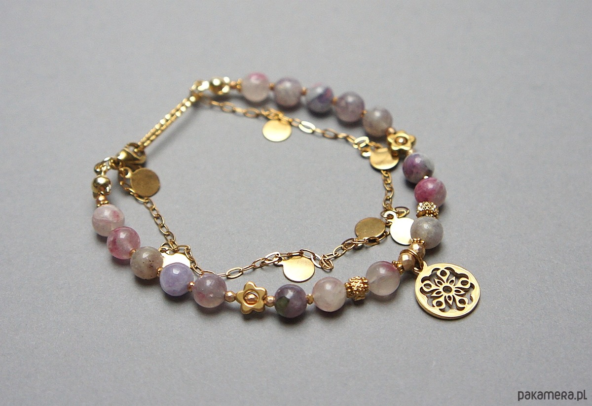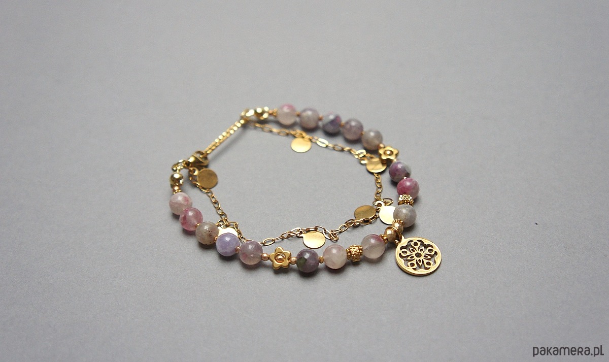 Delikatna bransoletka wykonana w całości ze stali szlachetnej pozłacanej, szlachetnych kamieni - turmalin śliwkowy [6mm], matowych hematytów [2mm i 3mm] oraz przekładek z hematytu [1mm oraz 6mm - kwiatki]. Całkowita długość bransoletki ok. 19,2cm. Biżuteria ozdobnie zapakowana.