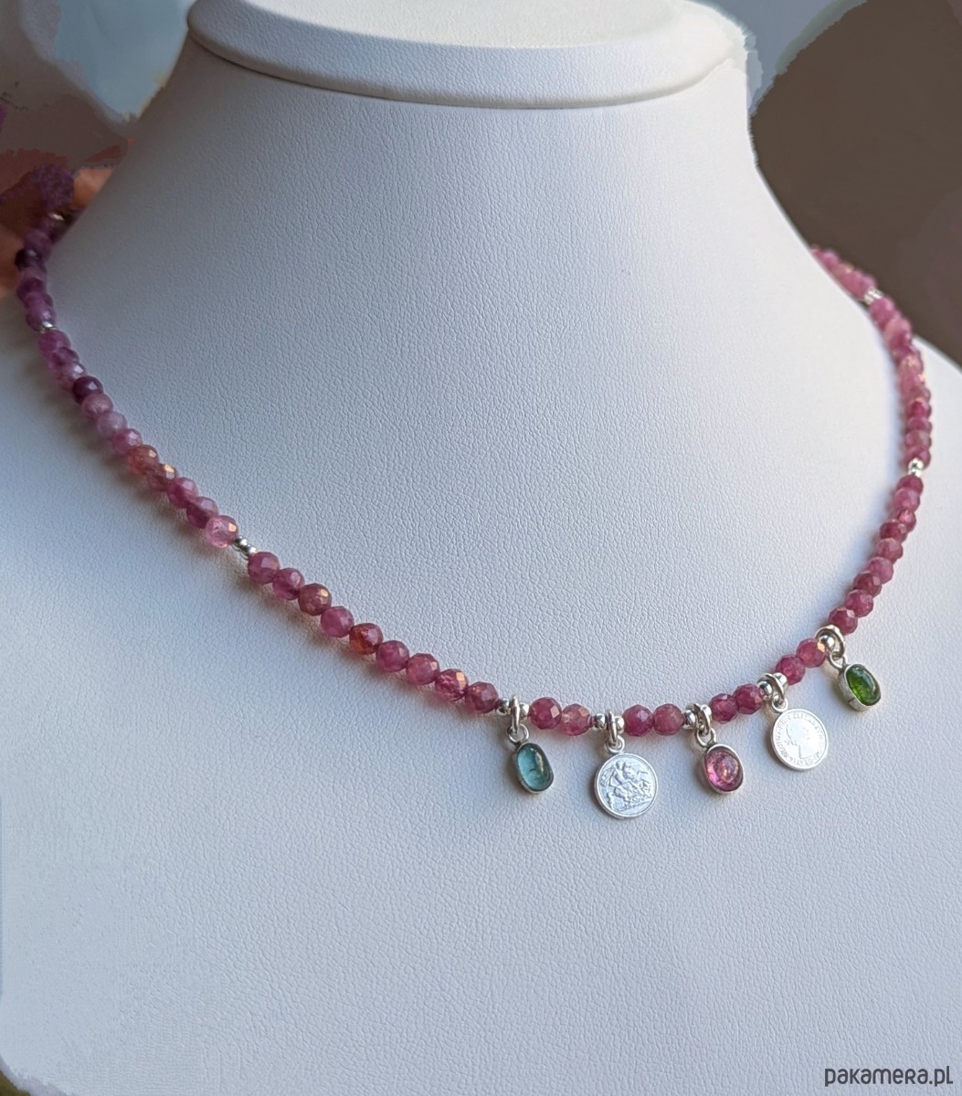 Różowy turmalin na sznurze wykończonym pięcioma zawieszkami: dwoma srebrnymi monetami i turmalinami w kolorach różowym , zielonym i niebieskawym. Na monetach królowa Elżbieta. W sam raz dla damy dworu ;)