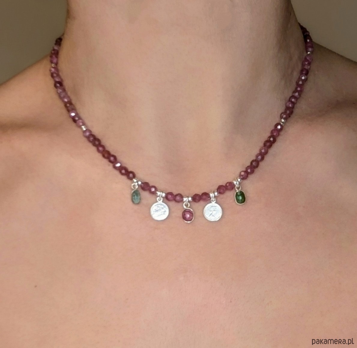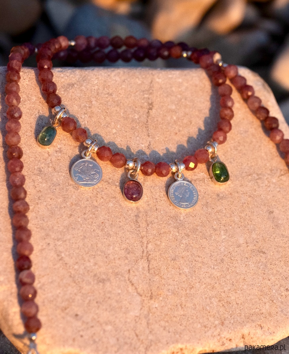 Różowy turmalin na sznurze wykończonym pięcioma zawieszkami: dwoma srebrnymi monetami i turmalinami w kolorach różowym , zielonym i niebieskawym. Na monetach królowa Elżbieta. W sam raz dla damy dworu ;)