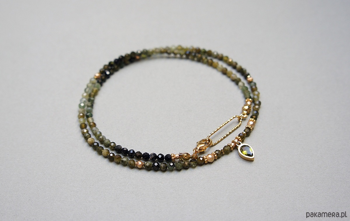 Krótki, delikatny naszyjnik wykonany w całości z pozłacanej stali szlachetnej oraz naturalnych, szlachetnych kamieni - fasetowanych zielonych turmalinów [3mm], hematytów fasetowanych, platerowanych [2mm i 3mm], przekładek z hematytu [1mm], zawieszki z cyrkonią w okuciu. Naszyjnik o długości ok. 44,5cm.