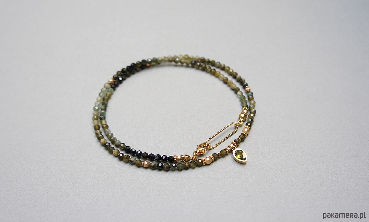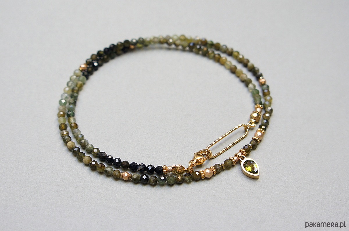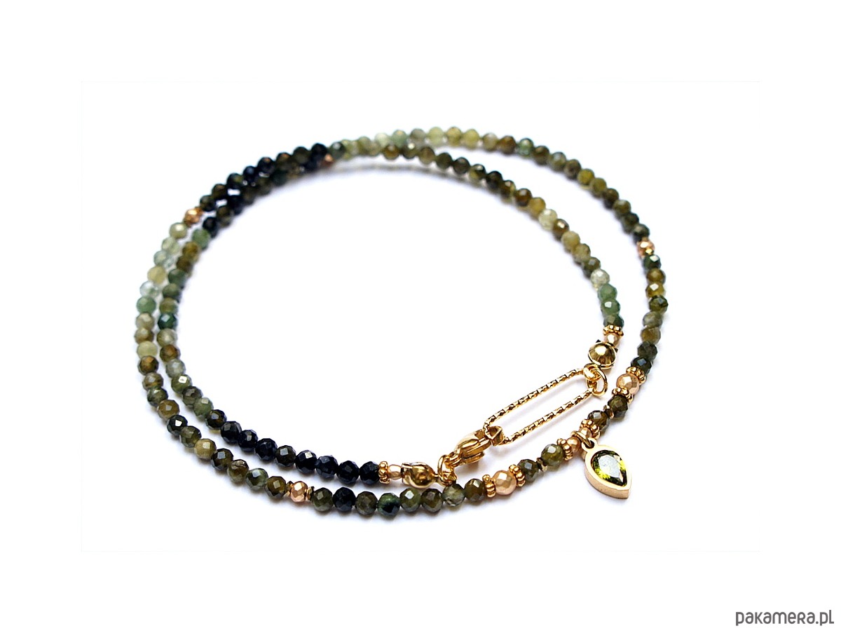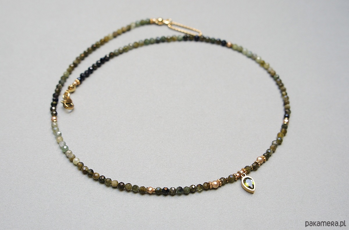 Krótki, delikatny naszyjnik wykonany w całości z pozłacanej stali szlachetnej oraz naturalnych, szlachetnych kamieni - fasetowanych zielonych turmalinów [3mm], hematytów fasetowanych, platerowanych [2mm i 3mm], przekładek z hematytu [1mm], zawieszki z cyrkonią w okuciu. Naszyjnik o długości ok. 44,5cm.