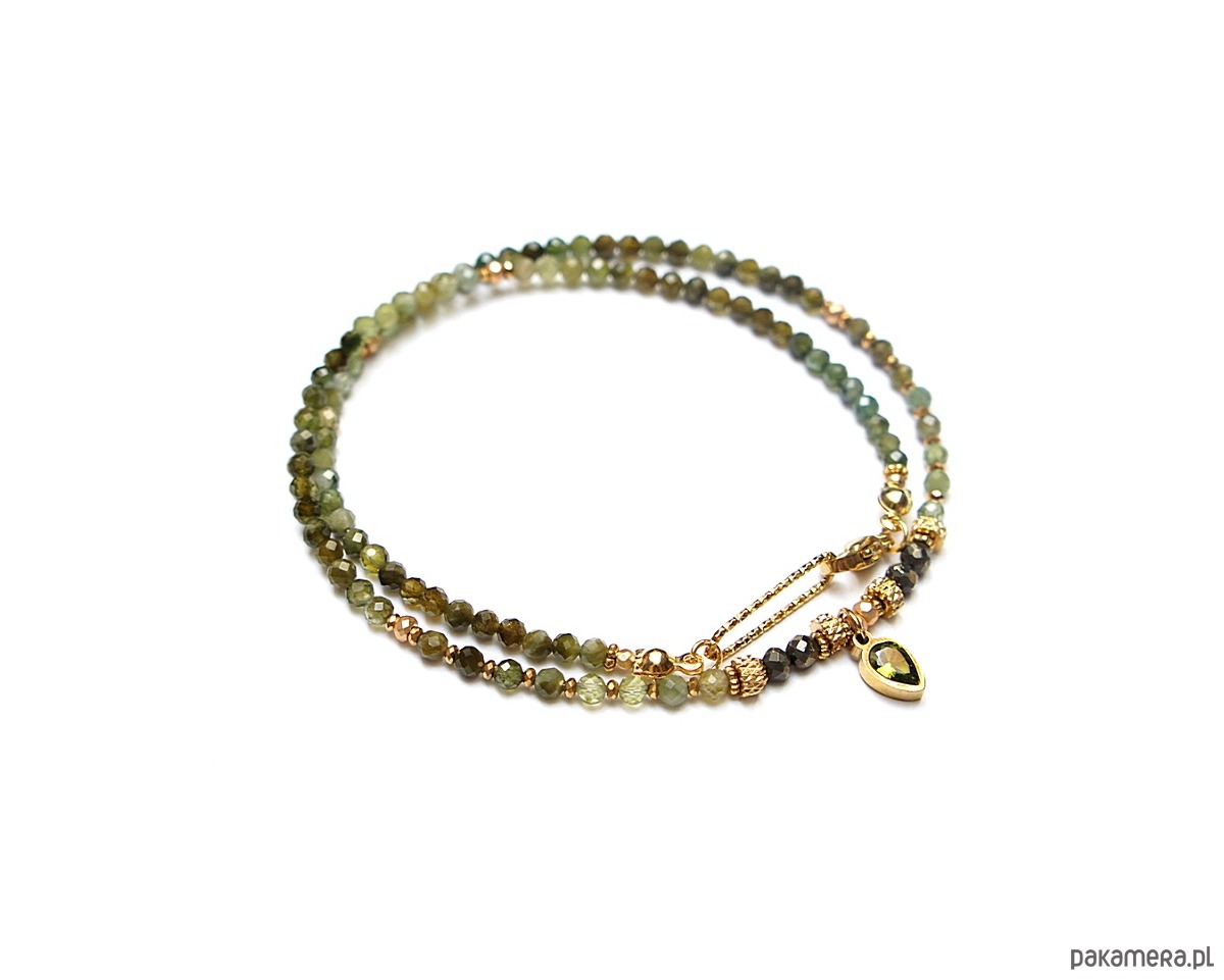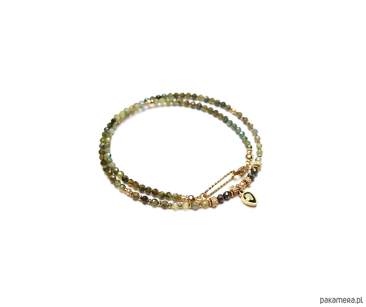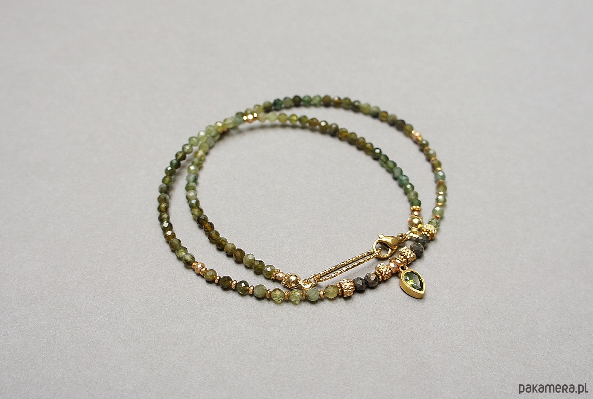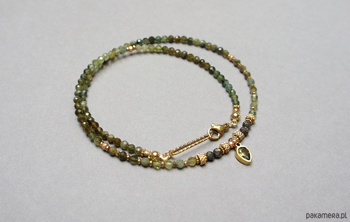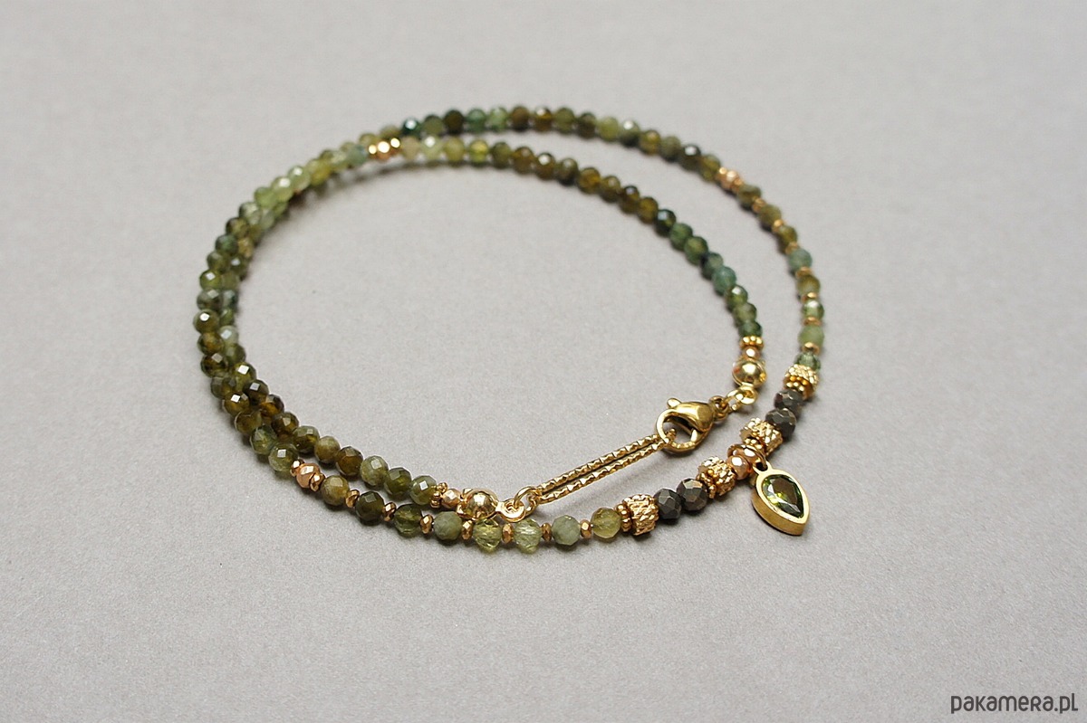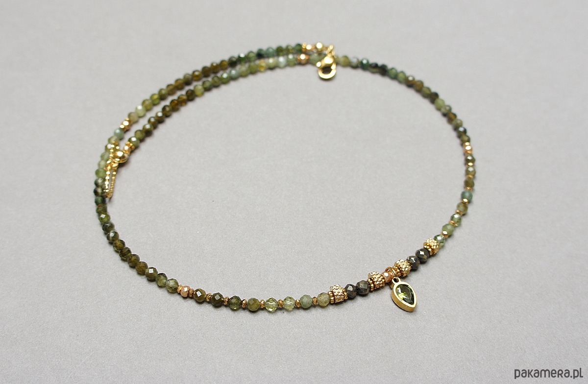 Krótki, delikatny naszyjnik wykonany w całości z pozłacanej stali szlachetnej oraz naturalnych, szlachetnych kamieni - fasetowanych zielonych turmalinów [3mm], pirytu fasetowanego o surowej powłoce [3mm], hematytów fasetowanych, platerowanych [oponki 3 x 2mm], przekładek z hematytu [1mm], zawieszki z cyrkonią w okuciu. Naszyjnik o długości ok. 42,5cm.