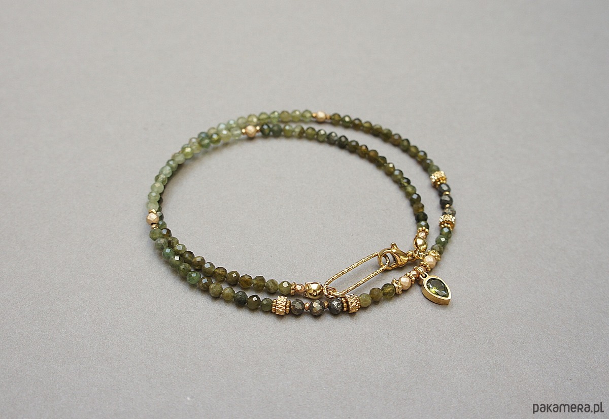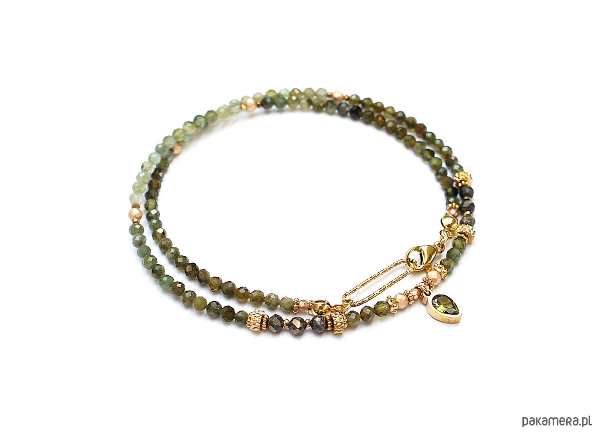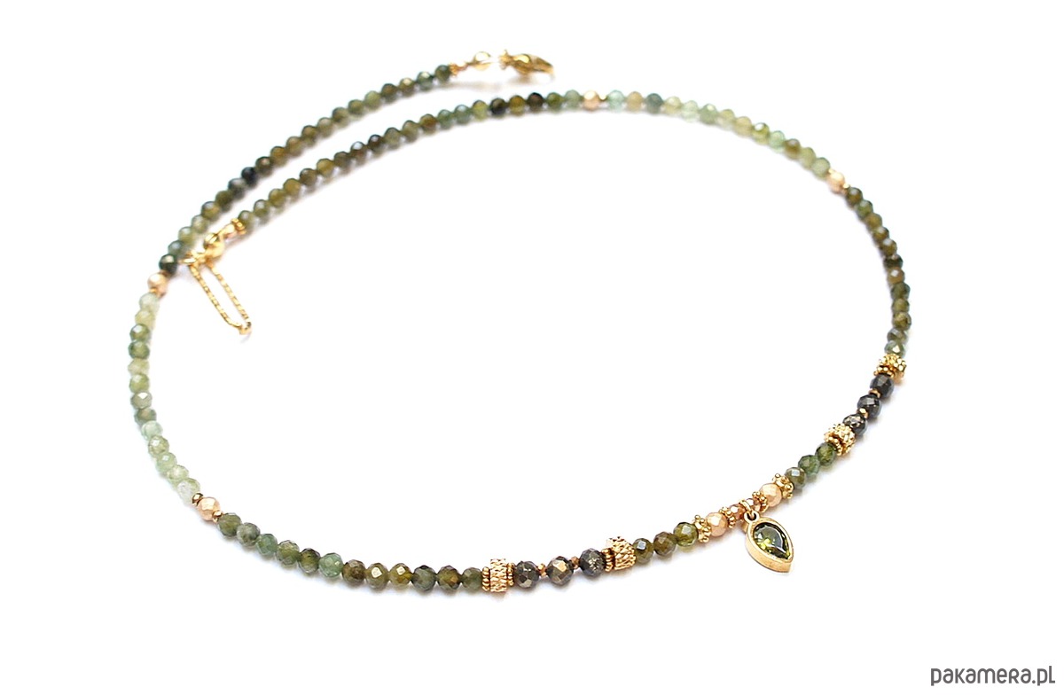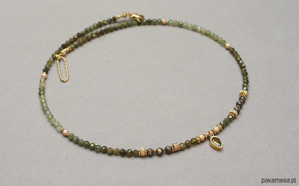 Krótki, delikatny naszyjnik wykonany w całości z pozłacanej stali szlachetnej oraz naturalnych, szlachetnych kamieni - fasetowanych zielonych turmalinów [3mm], pirytu fasetowanego [3mm], hematytu matowego, platerowanego [2mm, 3mm], przekładek z hematytu [1mm] oraz zawieszki z cyrkonią w okuciu. Naszyjnik o długości ok. 43cm.