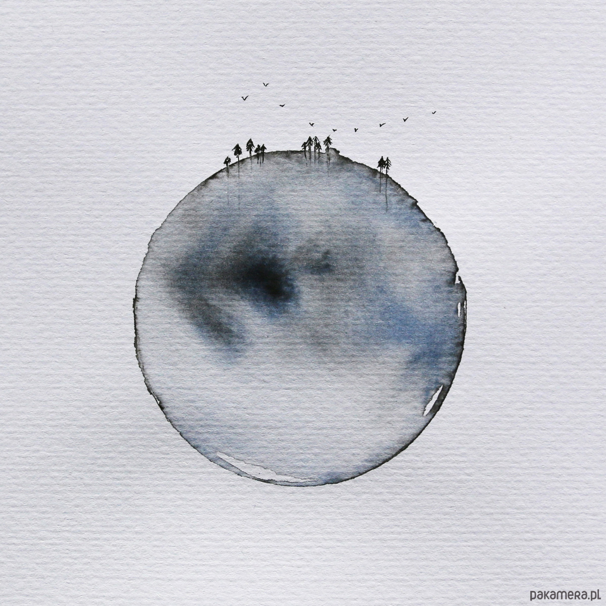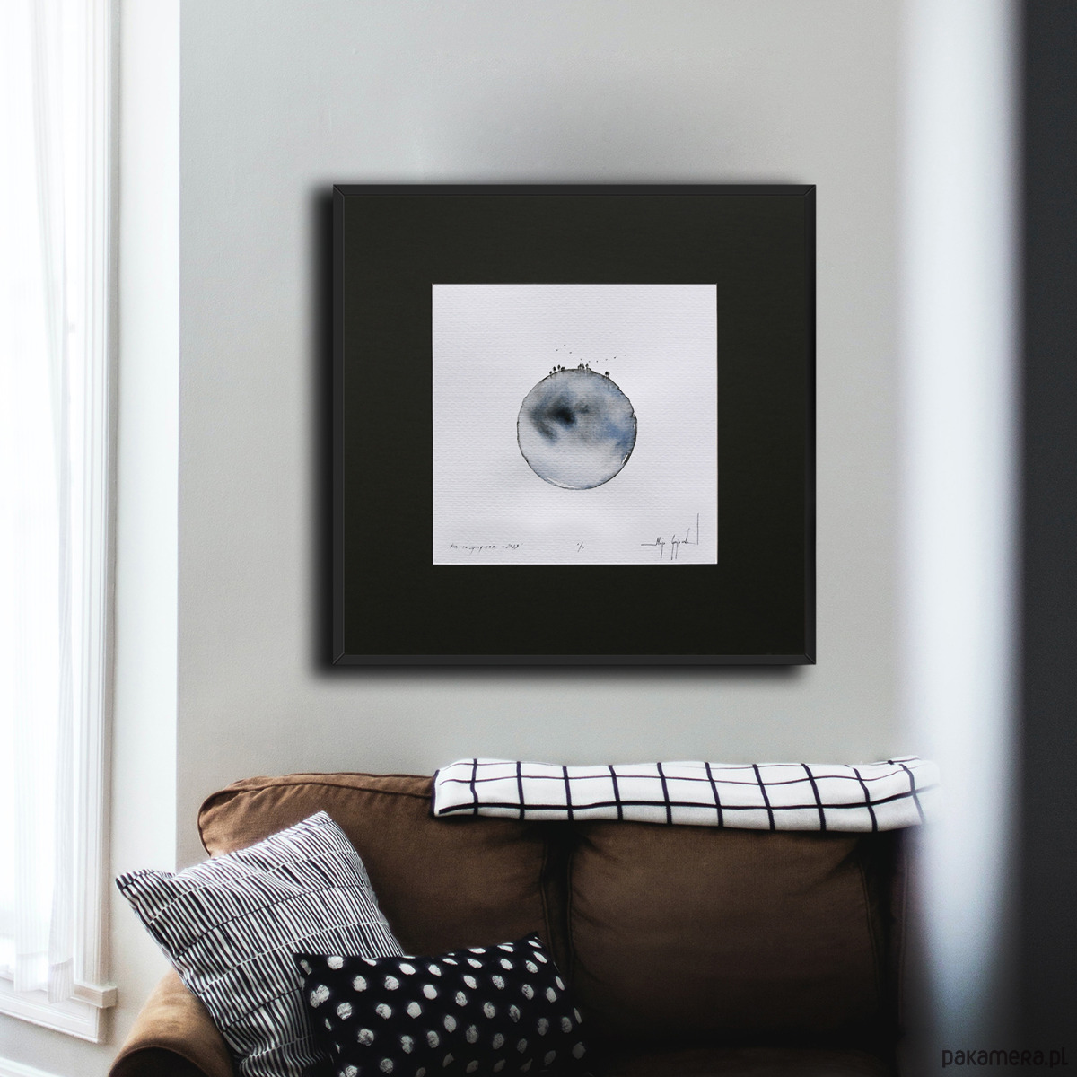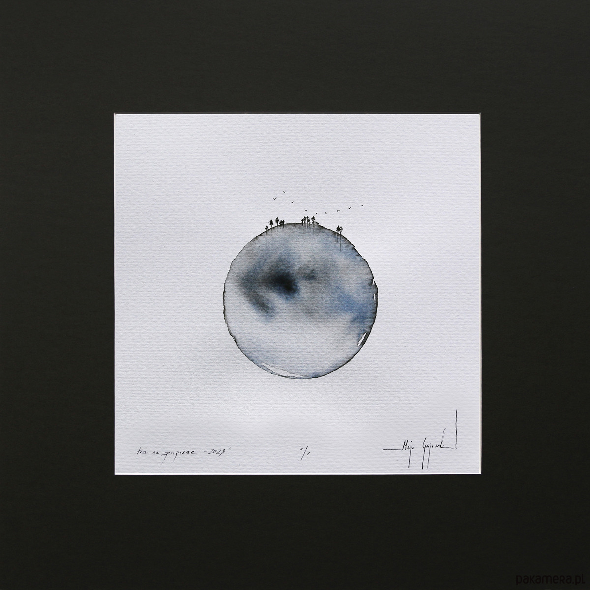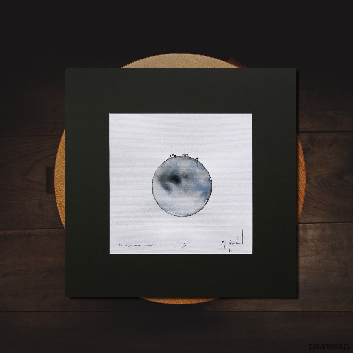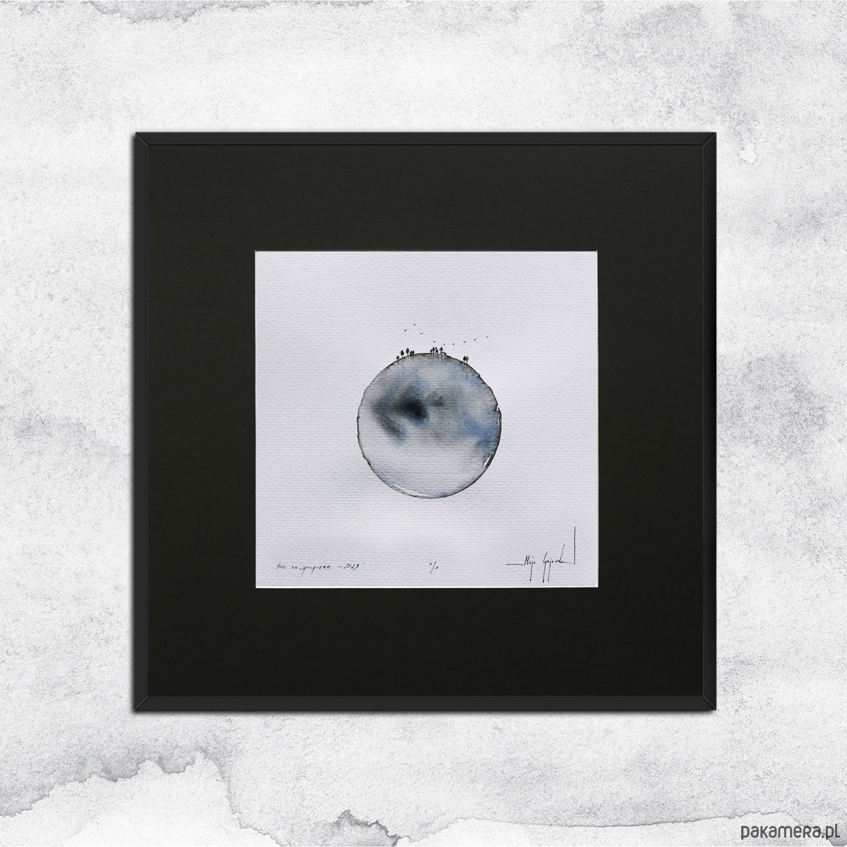 Autorski rysunek malowany ręcznie tuszem i akwarelą na białym, lekko fakturowanym papierze. Pojedyncza sztuka. Praca oprawiona jest w antracytowe passe partout i czarną, aluminiową ramę.