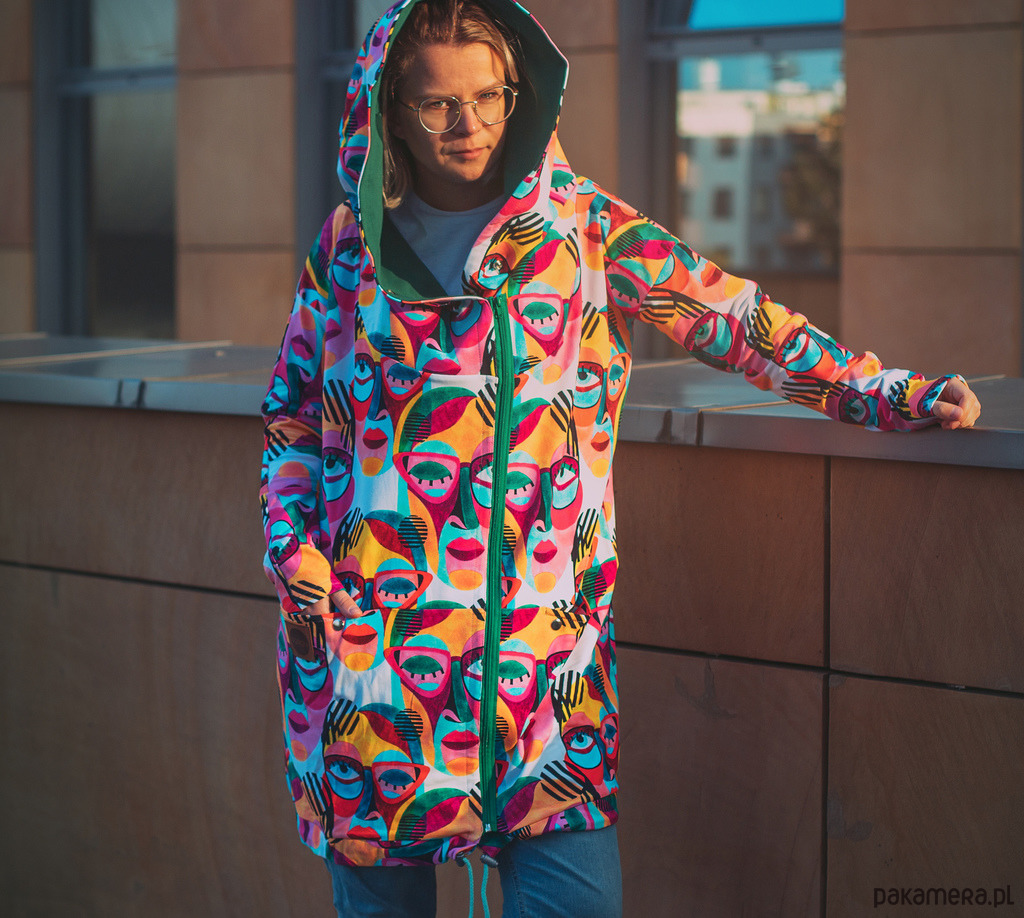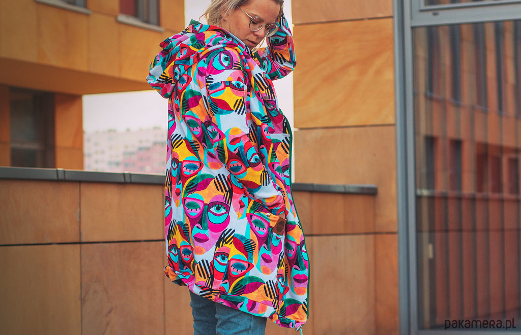Bluza posiada ogromny kaptur oraz dwie kieszenie (zapinane na napy).