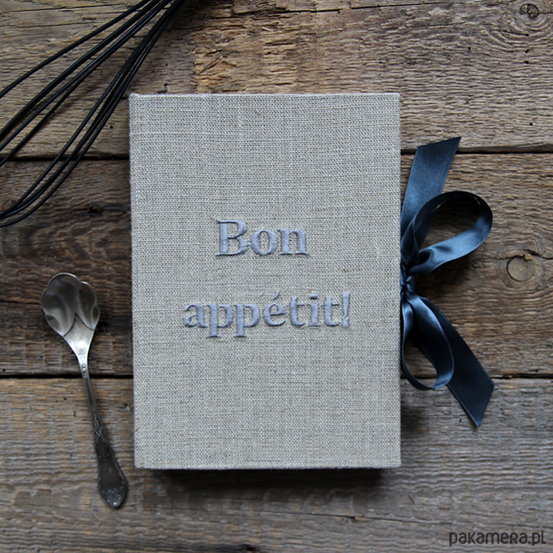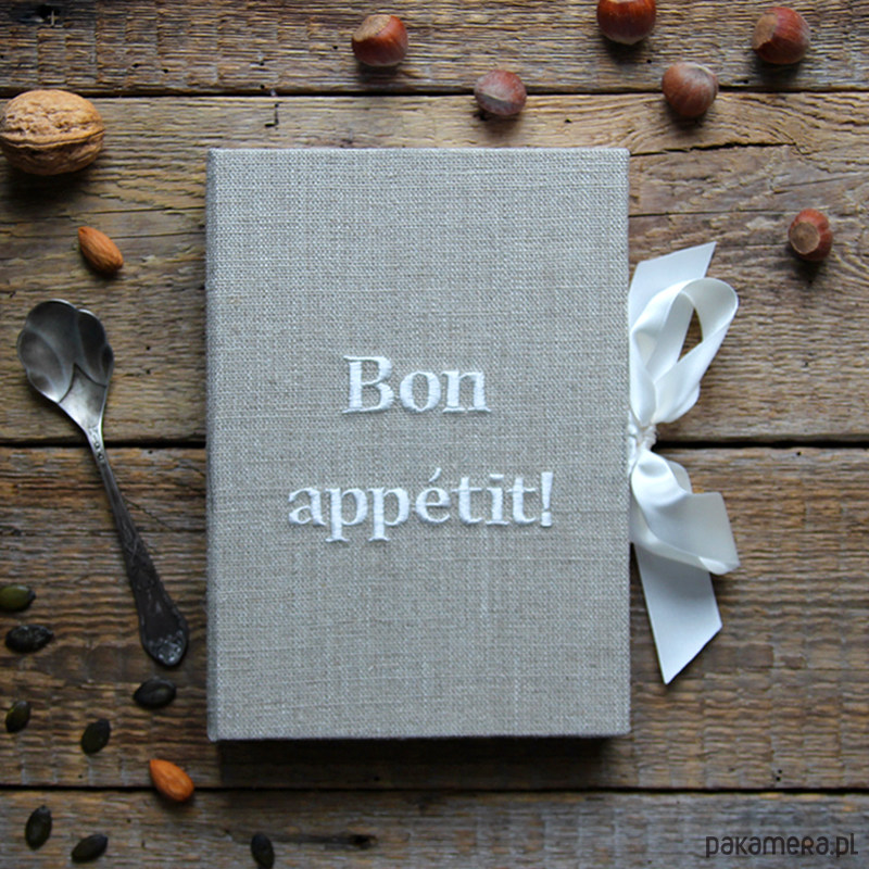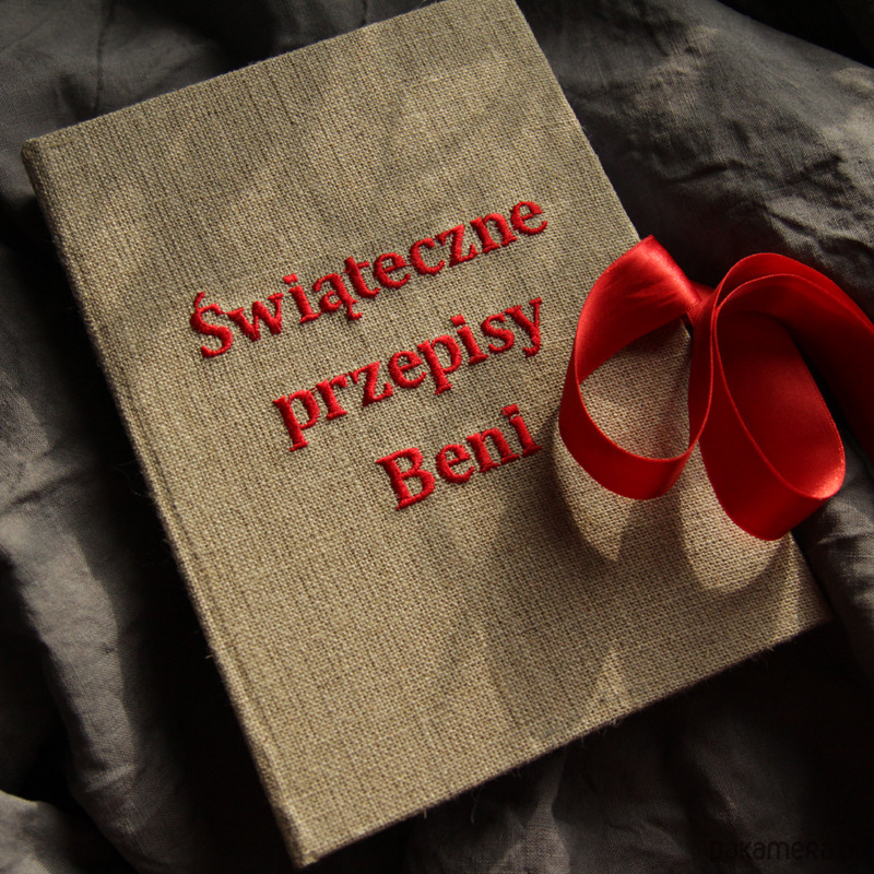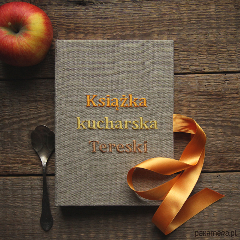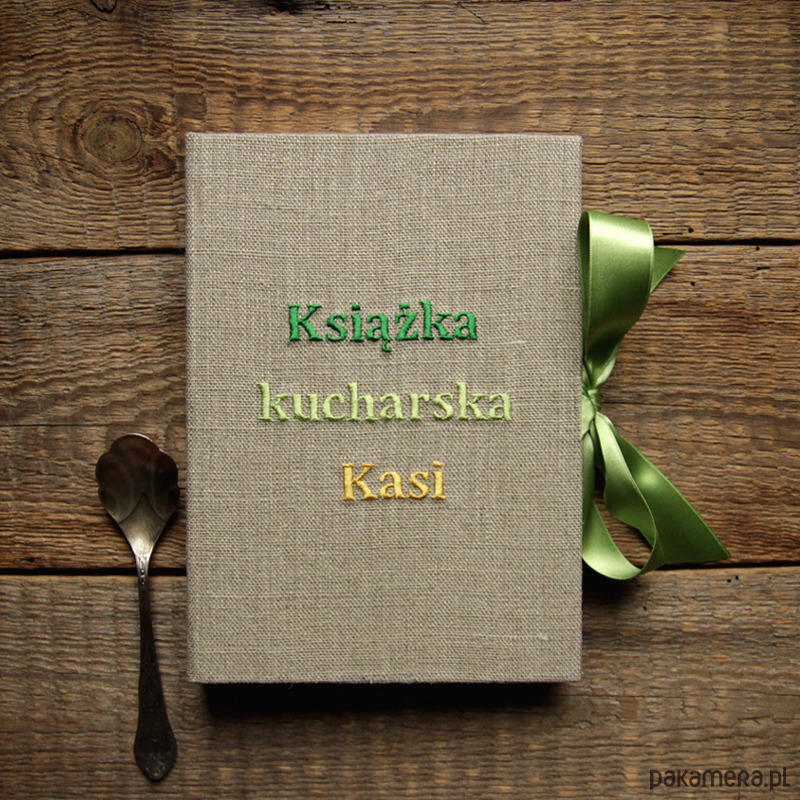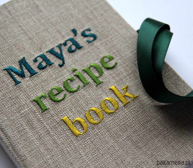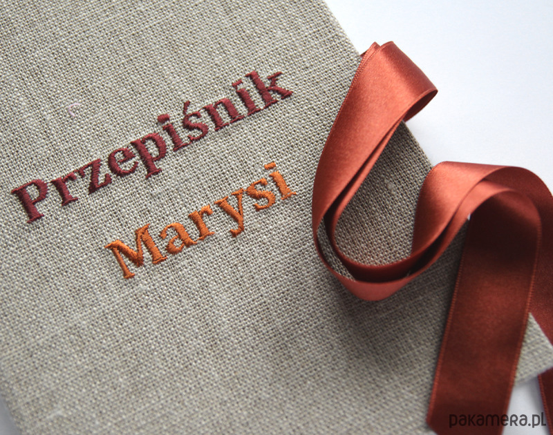 Personalizowana księga na przepisy, notes kulinarny, zeszyt z przepisami... Okładka obita grubym surowym płótnem lnianym z wyhaftowanym napisem - mogę wyhaftować dowolną treść w dowolnych kolorach, np. "ciasta Ani", "Książka kucharska Tosi" itd.