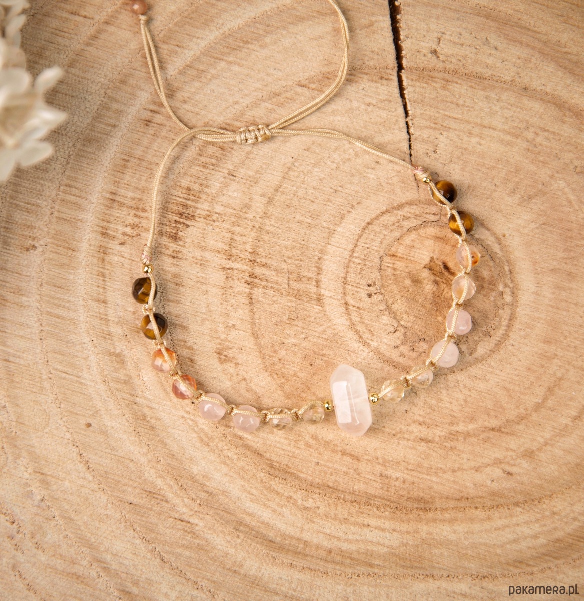 Ręcznie robiona bransoletka wykonana metodą splotu makramowego z wykorzystaniem mocnego sznurka nylonowego, z naturalnymi kamieniami: kwarcem różowym, cytrynem, agatem i tygrysim okiem.
