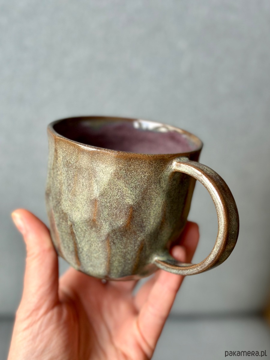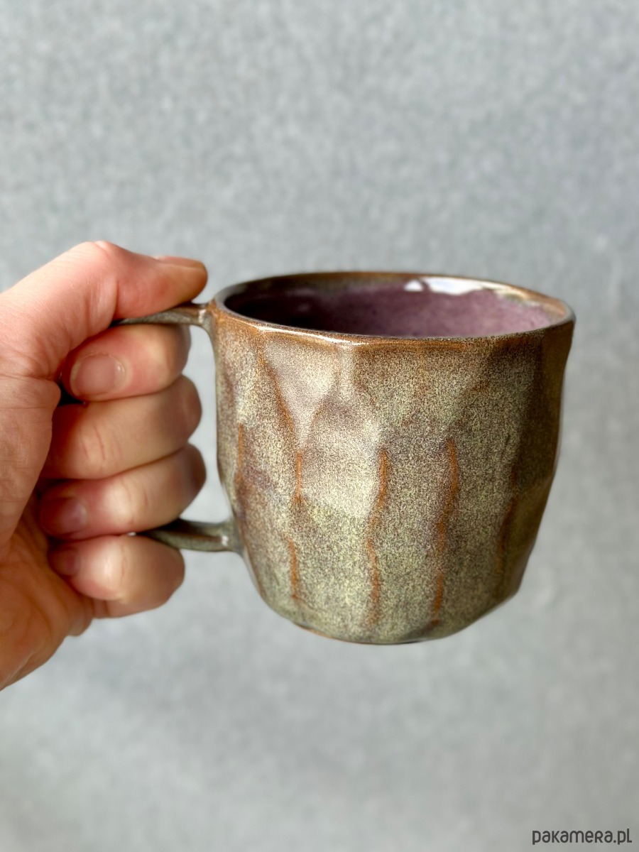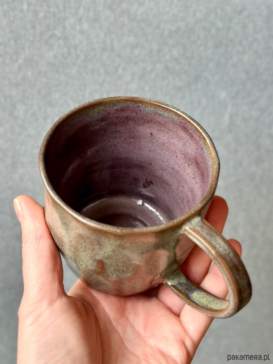 Kolorystyka to hipnotyzująca mieszanka ziemistych odcieni. Satynowe wykończenie z delikatnym nakrapianiem nadaje mu szlachetny, organiczny wygląd. Szerokie, wygodne ucho pozwala na stabilne trzymanie, a pękata forma sprawia, że kubek długo utrzymuje ciepło Twojego ulubionego napoju. Środek wykończony gładkim szkliwem w odcieniu przygaszonego fioletu/śliwki tworzy piękny kontrast z zewnętrzną stroną.