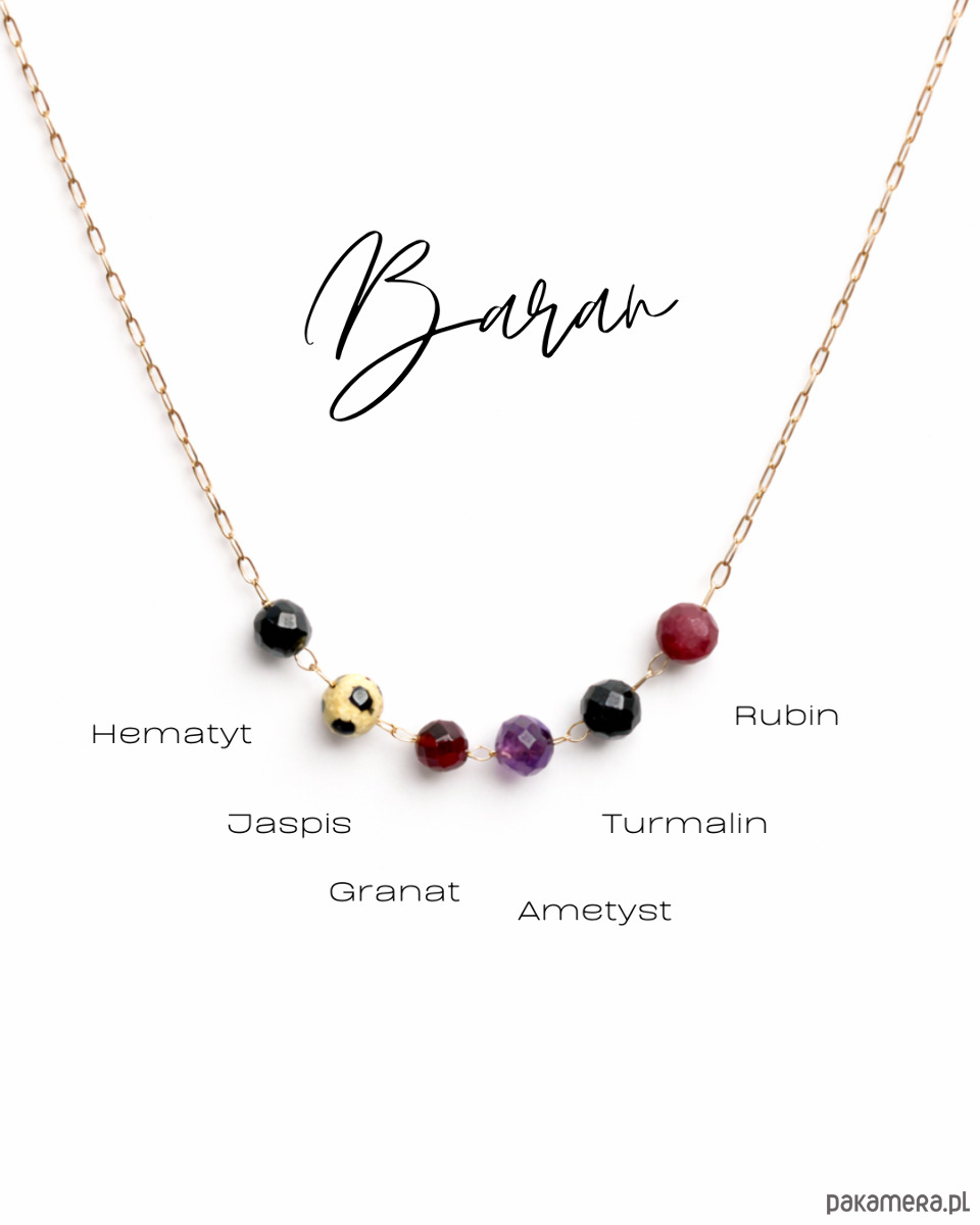 Naszyjnik zodiakalny Baran wykonany ręcznie w warszawskiej pracowni GLAM z naturalnych kamieni dobranych do energii tego znaku. Delikatny, a jednocześnie wytrzymały łańcuszek ze stali 316L stanowi subtelną bazę dla kompozycji kamieni i zapewnia komfort codziennego noszenia.