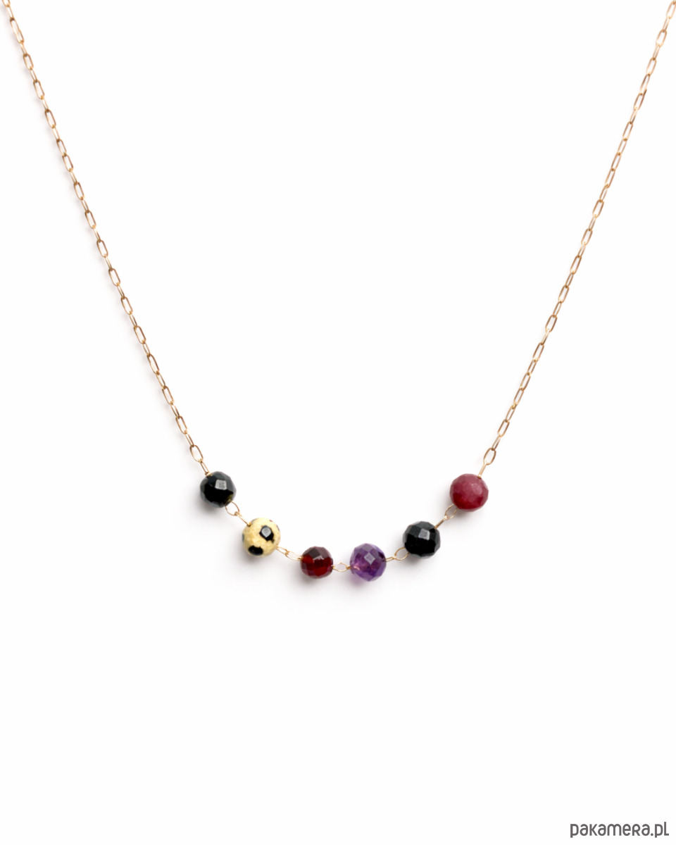 W centralnej części naszyjnika znajdują się fasetowane kamienie naturalne: hematyt, jaspis, granat, ametyst, turmalin oraz rubin. Każdy z nich wnosi inny akcent kolorystyczny i symboliczny, tworząc spójną, harmonijną całość o minimalistycznym, ale wyrazistym charakterze. Naturalne kamienie mogą nieznacznie różnić się odcieniem i strukturą, co jest ich cechą charakterystyczną i potwierdzeniem autentyczności.