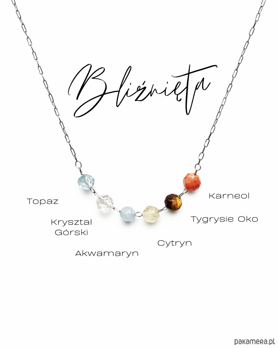 Naszyjnik zodiakalny Bliźnięta wykonany ręcznie w warszawskiej pracowni GLAM z naturalnych kamieni dobranych do charakteru tego znaku. Delikatny, a jednocześnie wytrzymały łańcuszek ze stali 316L w kolorze srebrnym stanowi subtelną bazę dla kompozycji kamieni i zapewnia komfort codziennego noszenia.
