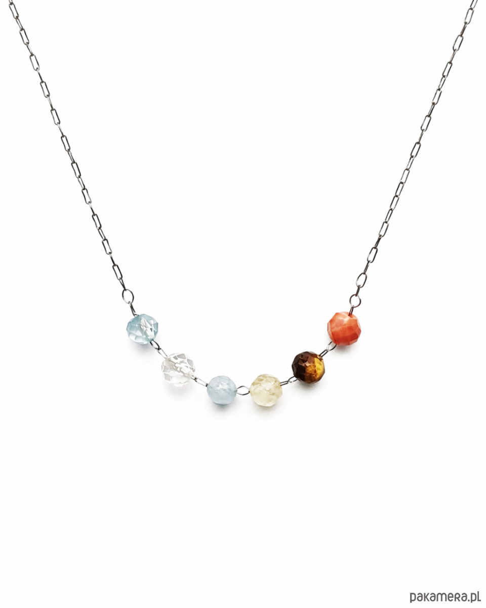 W centralnej części naszyjnika znajduje się harmonijna sekwencja fasetowanych kamieni naturalnych: topaz, kryształ górski, akwamaryn, cytryn, tygrysie oko oraz karneol. Ich zróżnicowana kolorystyka i lekka forma oddają zmienność, ciekawość świata i komunikacyjny charakter Bliźniąt. Każdy kamień wnosi inny akcent wizualny, tworząc spójną, ale dynamiczną całość.