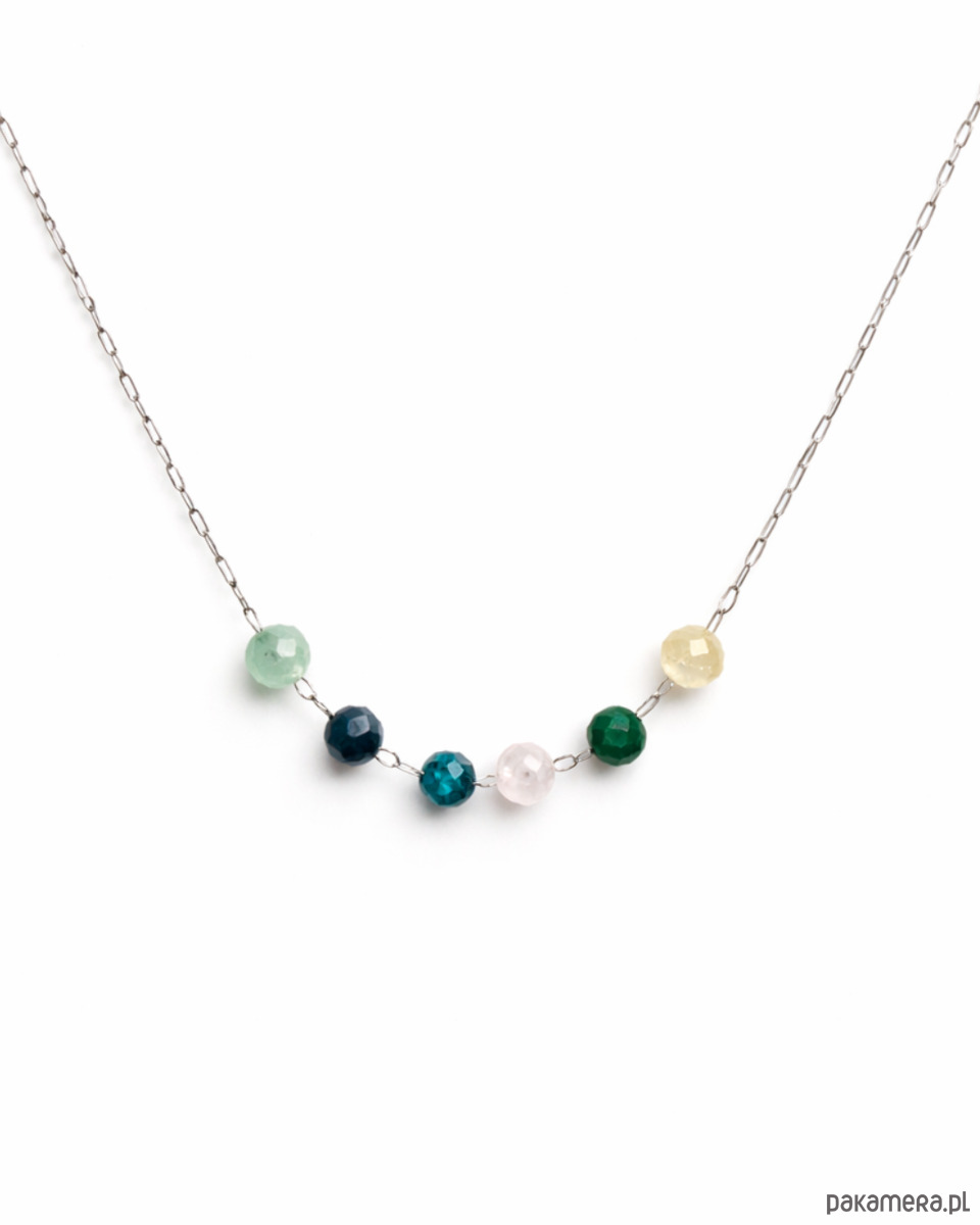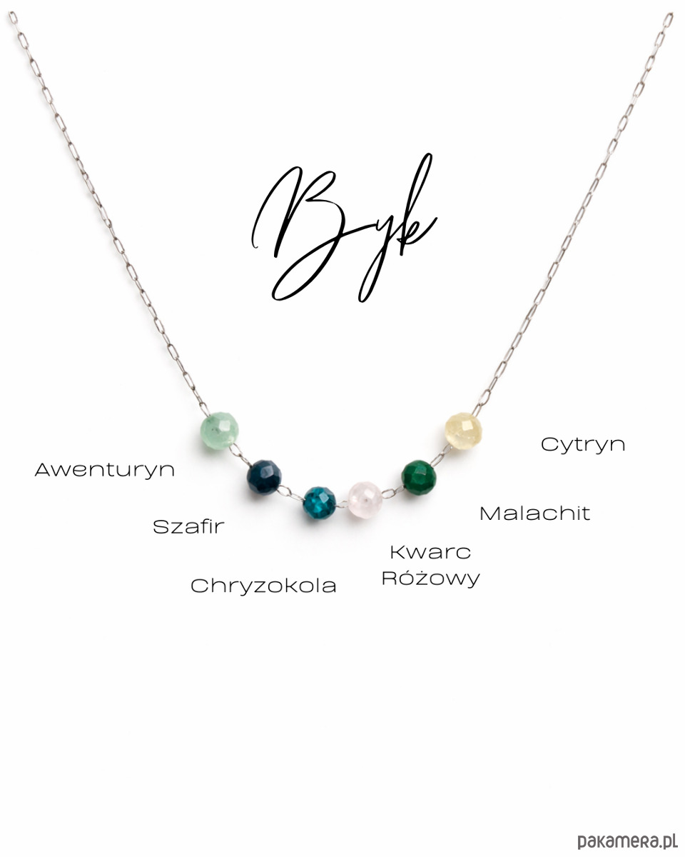 W centralnej części naszyjnika znajduje się harmonijna sekwencja fasetowanych kamieni naturalnych: awenturyn, szafir, chryzokola, kwarc różowy, malachit oraz cytryn. Ich stonowana, ziemista kolorystyka podkreśla stabilność, zmysłowość i potrzebę harmonii, które są charakterystyczne dla znaku Byka. Każdy kamień wnosi inny akcent wizualny, tworząc spójną, spokojną kompozycję o eleganckim charakterze.
