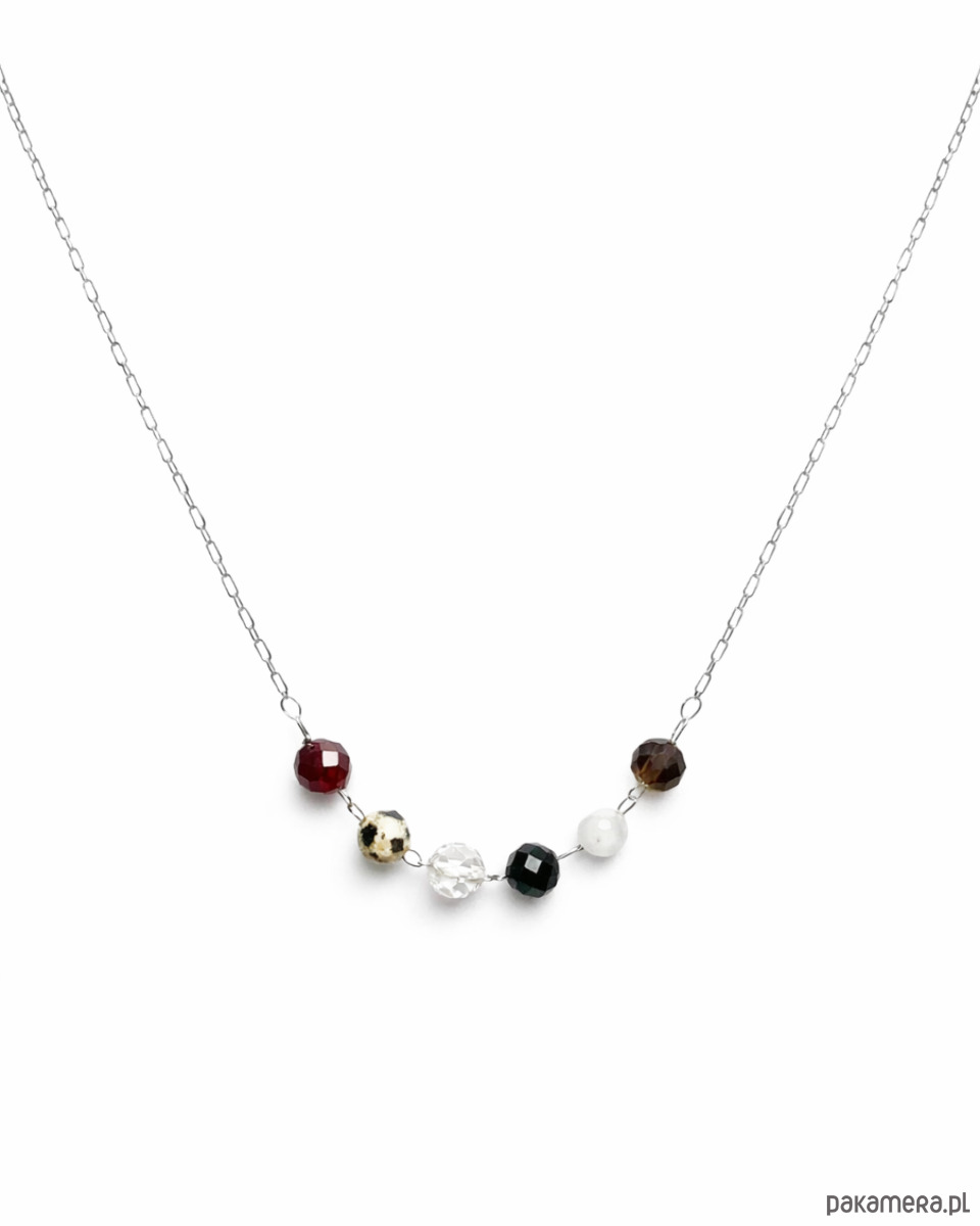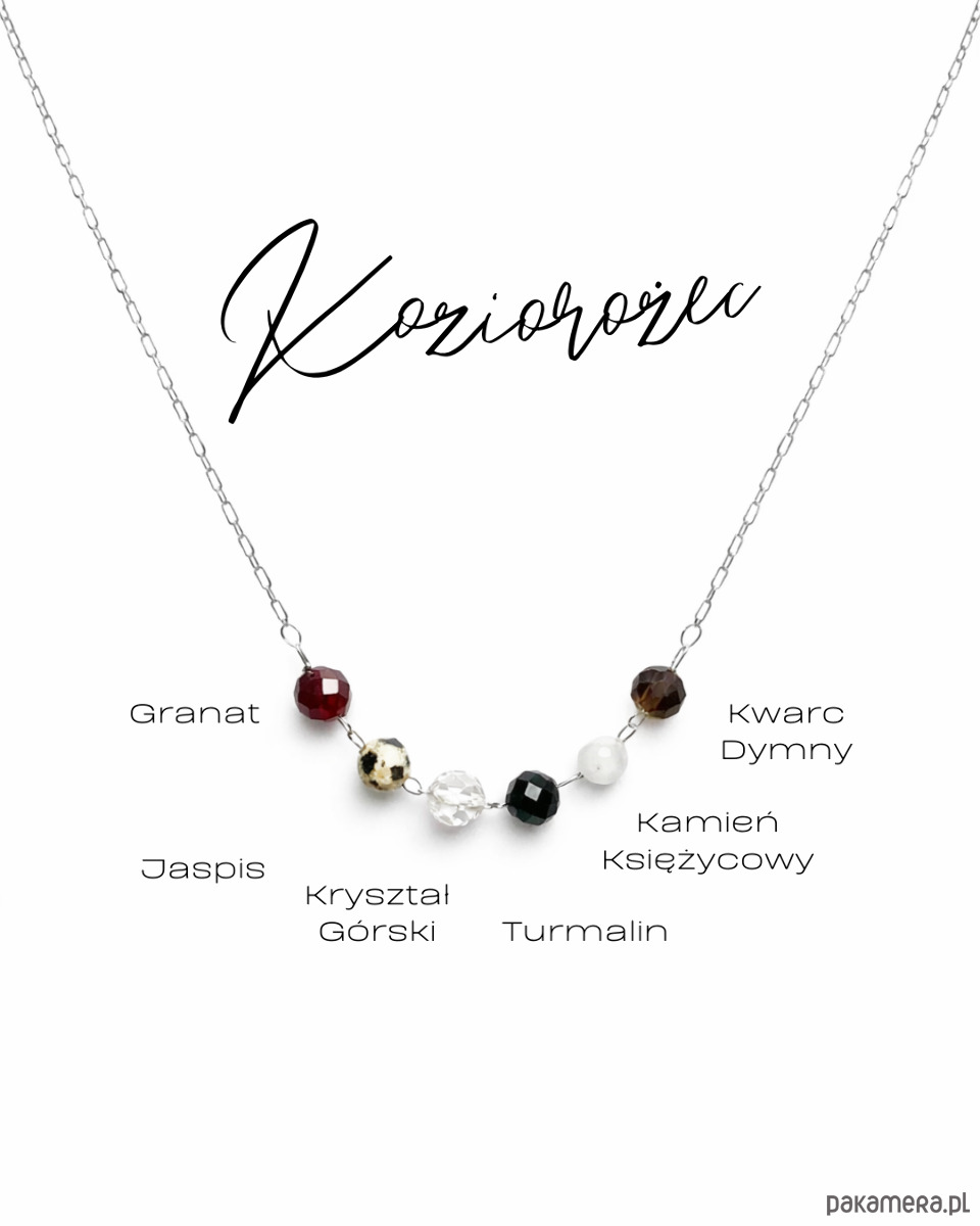 W centralnej części naszyjnika znajduje się harmonijna sekwencja fasetowanych kamieni naturalnych: granat, jaspis, kryształ górski, turmalin, kamień księżycowy oraz kwarc dymny. Ich głęboka, ziemista kolorystyka podkreśla wytrwałość, odpowiedzialność i konsekwencję, które są charakterystyczne dla znaku Koziorożca. Kompozycja jest klasyczna, uporządkowana i pełna subtelnej siły.