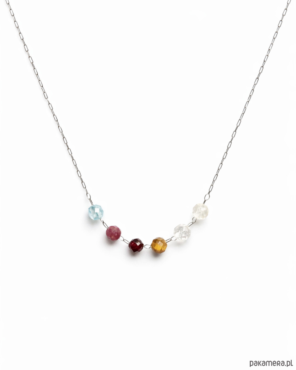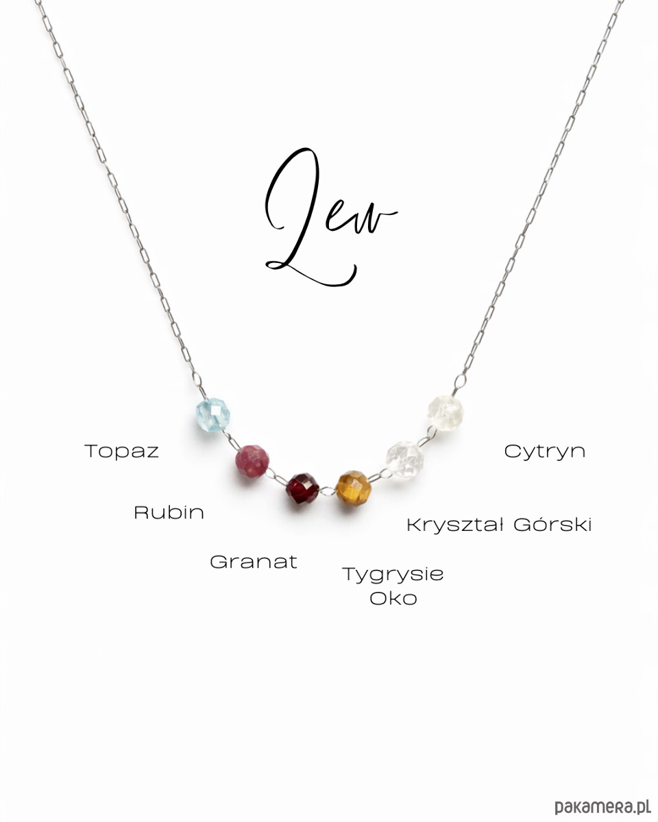 W centralnej części naszyjnika znajduje się harmonijna sekwencja fasetowanych kamieni naturalnych: topaz, rubin, granat, tygrysie oko, kryształ górski oraz cytryn. Ich intensywna, świetlista kolorystyka podkreśla charyzmę, pewność siebie i naturalne przywództwo, które są charakterystyczne dla znaku Lwa. Kompozycja jest dynamiczna, ale zachowuje elegancką równowagę.