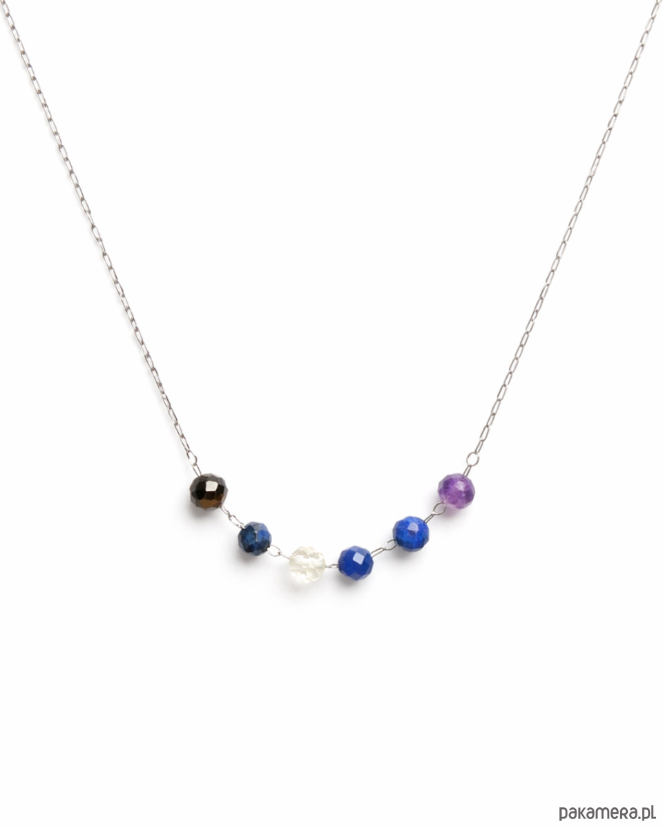 W centralnej części naszyjnika znajduje się sekwencja fasetowanych kamieni naturalnych: tygrysie oko, szafir, cytryn, sodalit, lapis lazuli oraz ametyst. Ich głęboka, uporządkowana kolorystyka podkreśla analityczność, precyzję i wewnętrzną równowagę, które są charakterystyczne dla znaku Panny. Kompozycja jest wyważona i elegancka, a jednocześnie ma w sobie subtelny akcent wyrazistości.