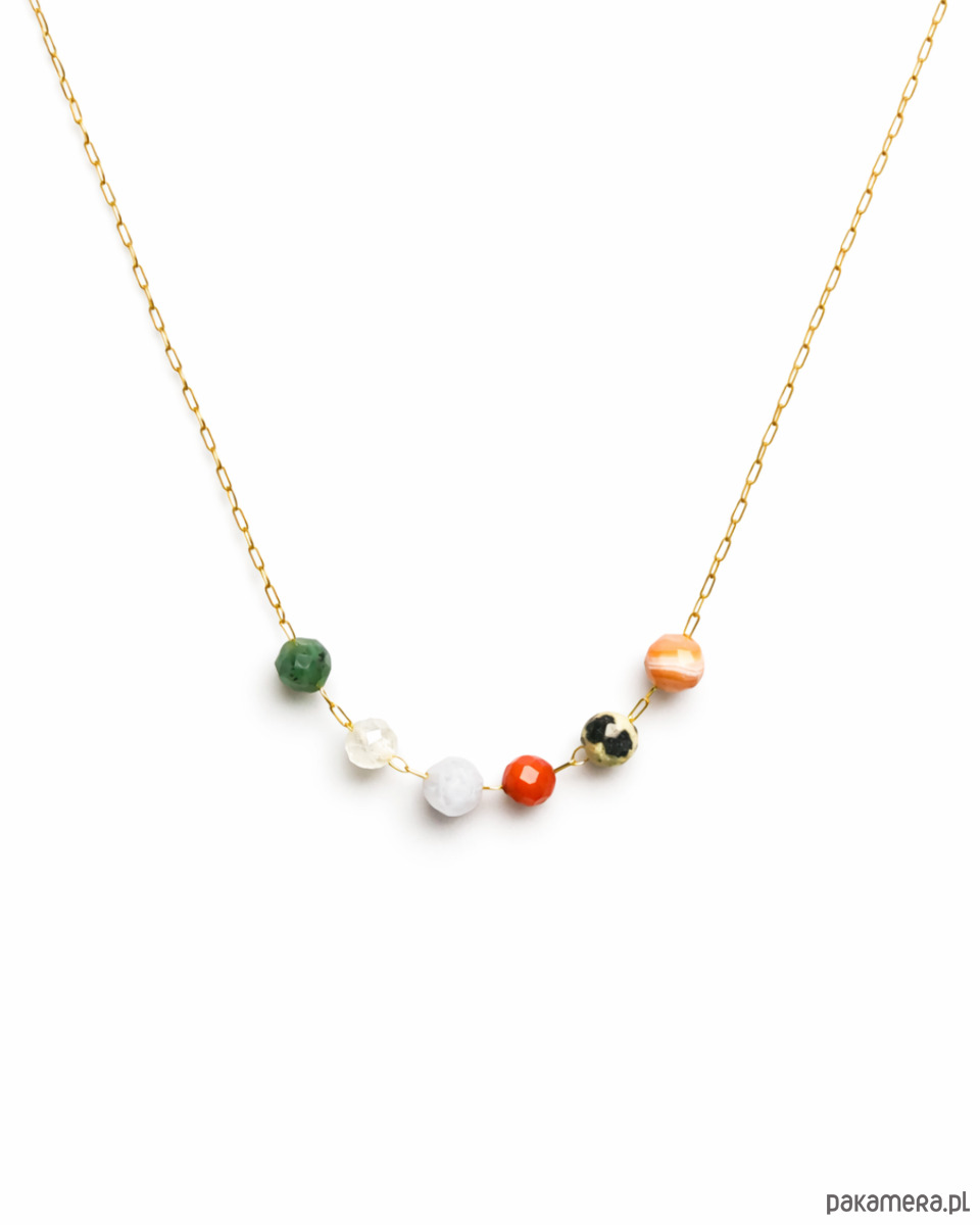 W centralnej części naszyjnika znajduje się harmonijna sekwencja fasetowanych kamieni naturalnych: szmaragd, kamień księżycowy, chalcedon, koral, jaspis oraz karneol. Ich miękka, zróżnicowana kolorystyka nawiązuje do wrażliwości, intuicji i emocjonalnej głębi, które są charakterystyczne dla znaku Raka. Kompozycja jest wyważona i spokojna, a jednocześnie pełna subtelnej energii.