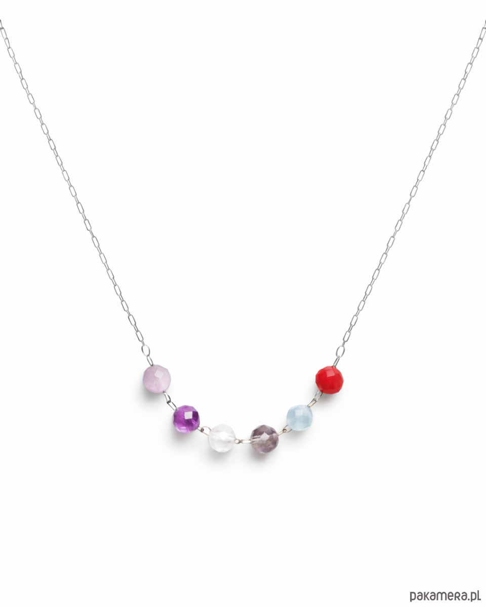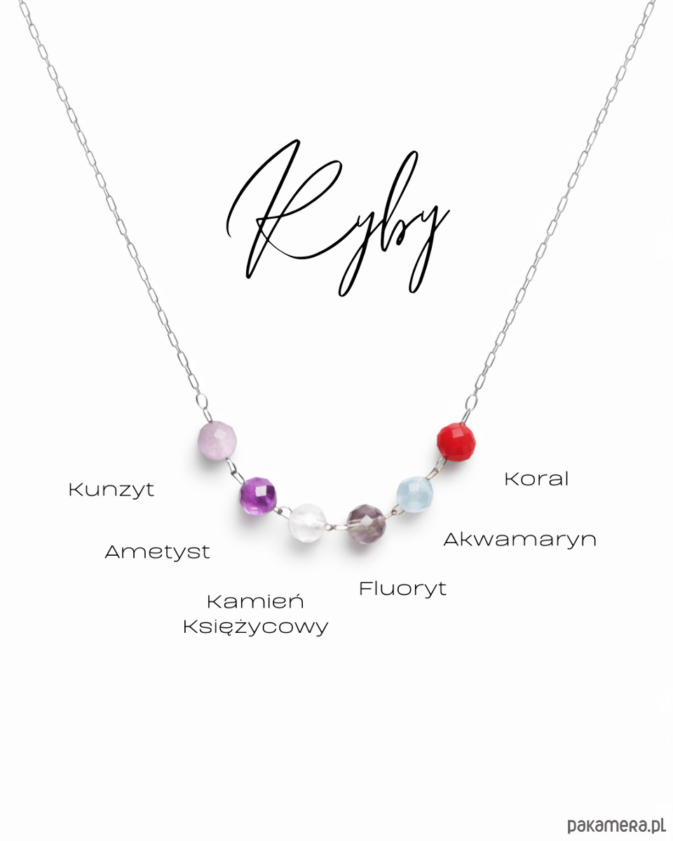 W centralnej części naszyjnika znajduje się sekwencja fasetowanych kamieni naturalnych: kunzyt, ametyst, kamień księżycowy, fluoryt, akwamaryn oraz koral. Pastelowe, miękkie barwy podkreślają intuicyjność, wrażliwość i emocjonalną głębię przypisywaną znakowi Ryb. Kompozycja jest harmonijna, delikatna i pełna spokojnego charakteru.