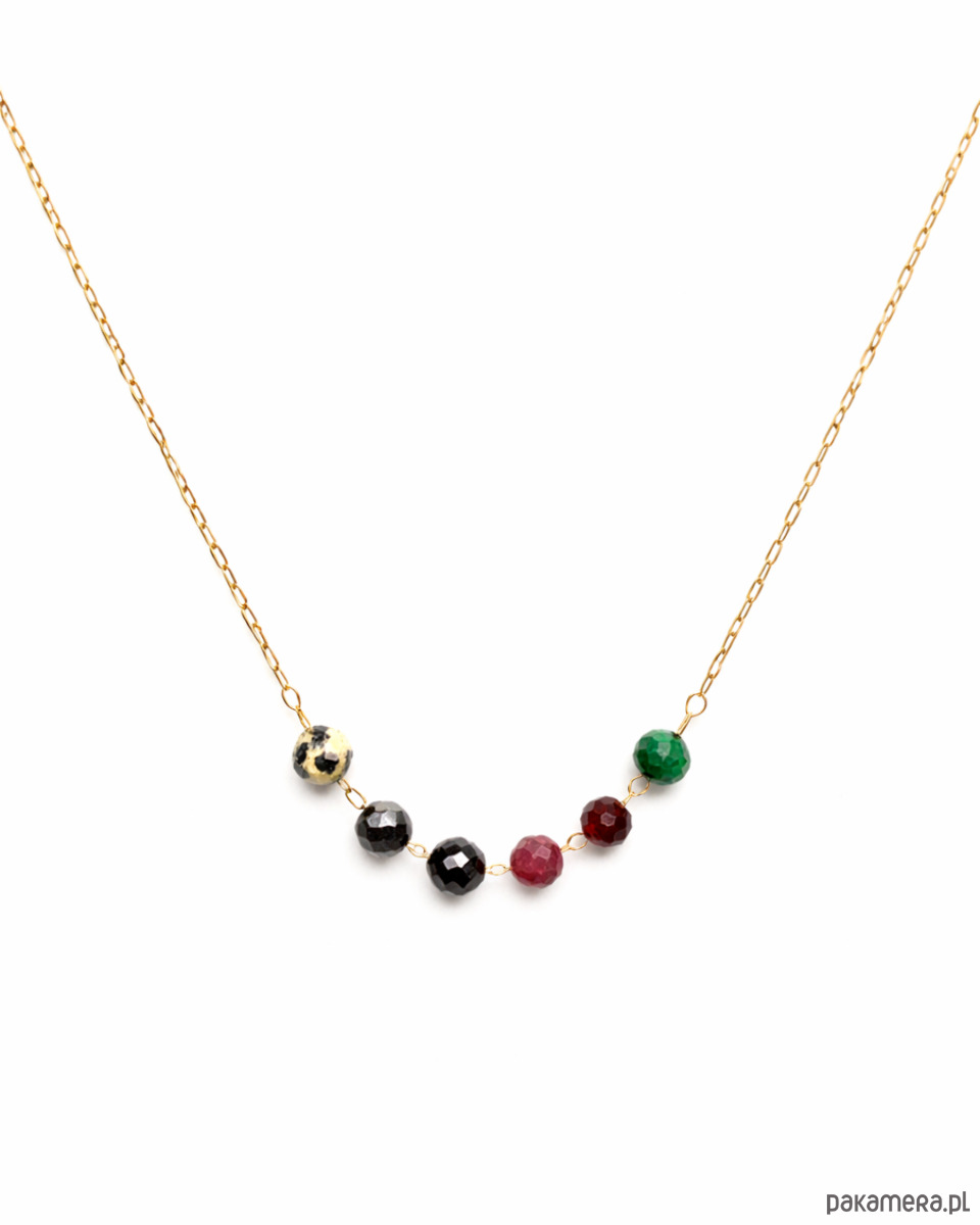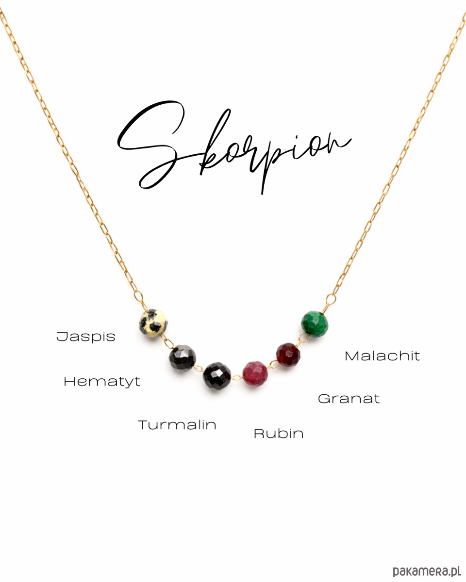 W centralnej części naszyjnika znajduje się harmonijna sekwencja fasetowanych kamieni naturalnych: jaspis, hematyt, turmalin, rubin, granat oraz malachit. Ich głęboka, kontrastowa kolorystyka podkreśla siłę, magnetyzm i emocjonalną intensywność, które są charakterystyczne dla znaku Skorpiona. Kompozycja jest mocna, zdecydowana i pełna charakteru, a złoty odcień łańcuszka dodaje jej elegancji i ciepła.