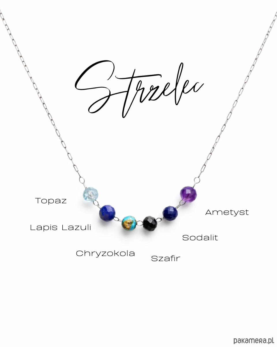 Naszyjnik zodiakalny Strzelec wykonany ręcznie w warszawskiej pracowni GLAM z naturalnych kamieni dobranych do energii tego znaku. Delikatny, a jednocześnie wytrzymały łańcuszek ze stali 316L w kolorze srebrnym stanowi subtelną bazę dla dynamicznej kompozycji kamieni i zapewnia komfort codziennego noszenia.