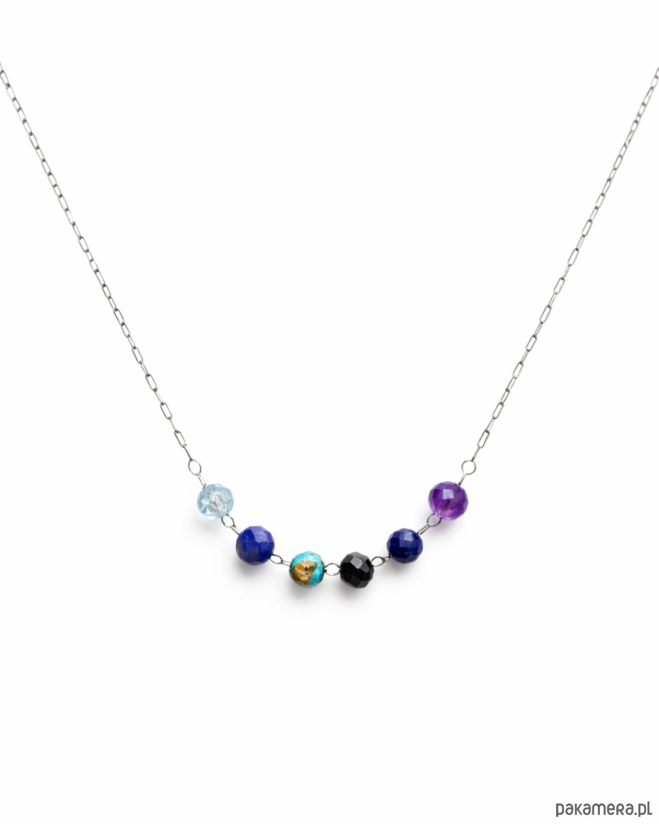 W centralnej części naszyjnika znajduje się harmonijna sekwencja fasetowanych kamieni naturalnych: topaz, lapis lazuli, chryzokola, szafir, sodalit oraz ametyst. Ich głęboka, intensywna kolorystyka podkreśla optymizm, niezależność i potrzebę odkrywania świata, które są charakterystyczne dla znaku Strzelca. Kompozycja jest energetyczna, a jednocześnie zachowuje elegancką lekkość formy.