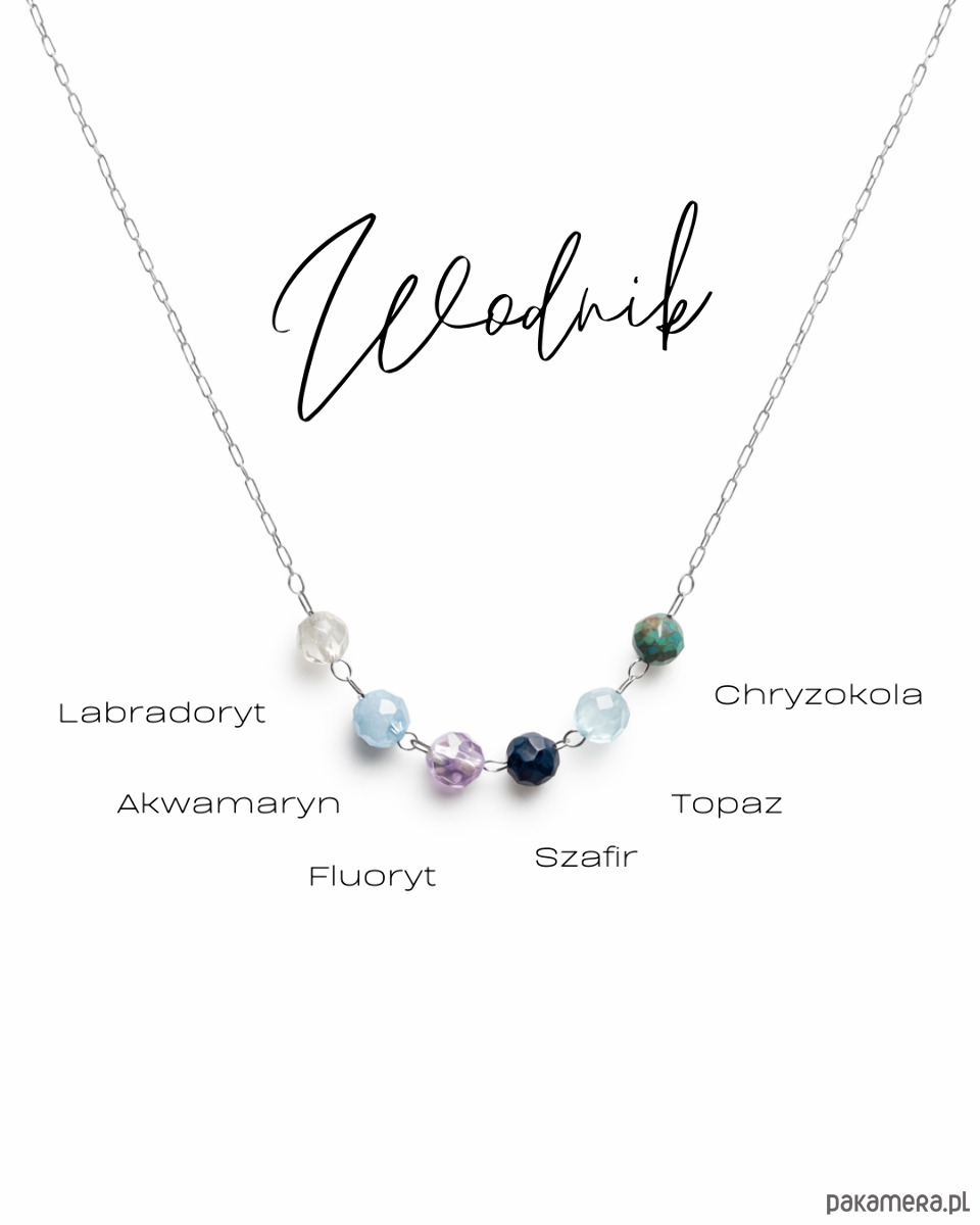 Naszyjnik zodiakalny Wodnik wykonany ręcznie w warszawskiej pracowni GLAM z naturalnych kamieni dobranych do energii tego znaku. Delikatny, a jednocześnie wytrzymały łańcuszek ze stali 316L w kolorze srebrnym stanowi subtelną bazę dla nowoczesnej, lekkiej kompozycji kamieni i zapewnia komfort codziennego noszenia.