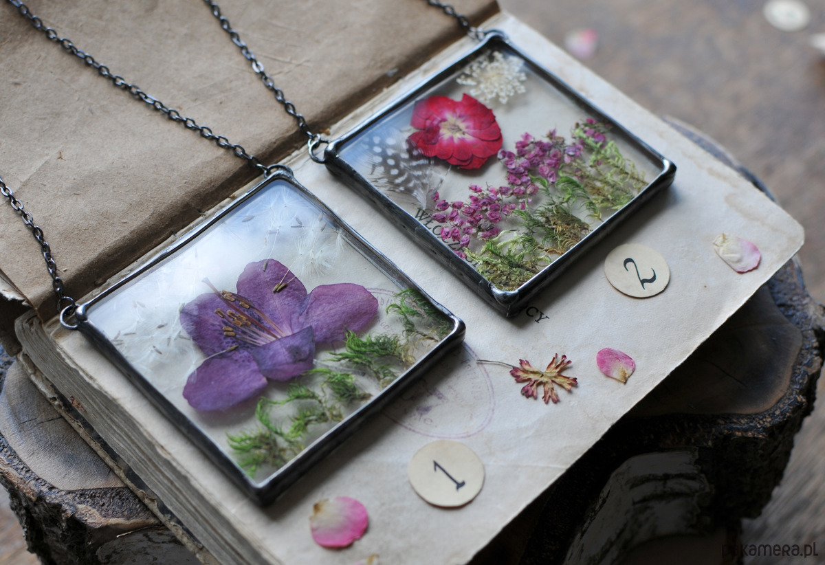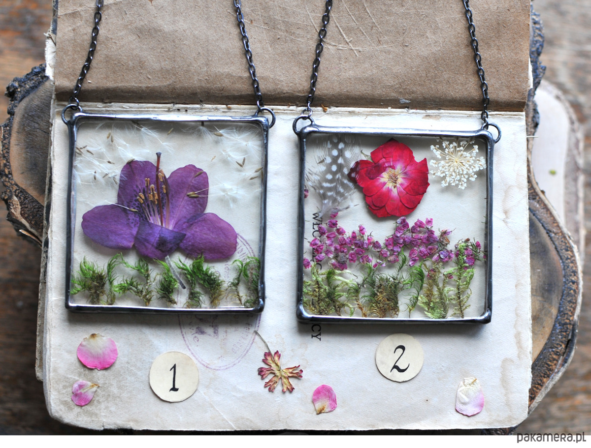 Długość boku 7 cm, szkło, naturalne suszone kwiaty, ekologiczna bezołowiowa cyna, łańcuszek.