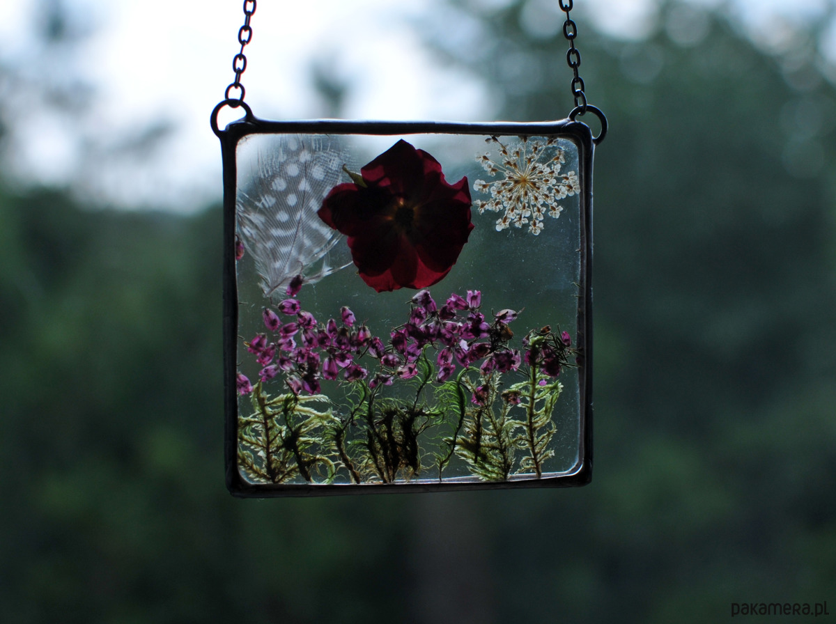Uroczy witraż wykonany z naturalnych kwiatów. Między dwoma taflami szkła zostały umieszczony mech, wrzos, piórka, różyczka, dmuchawiec i kwiat rododendronu.